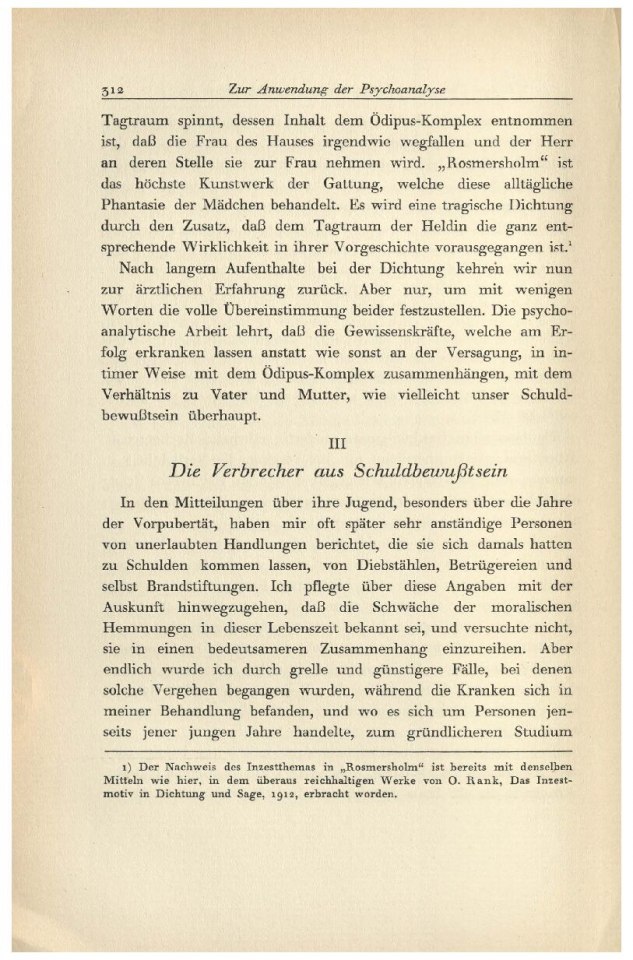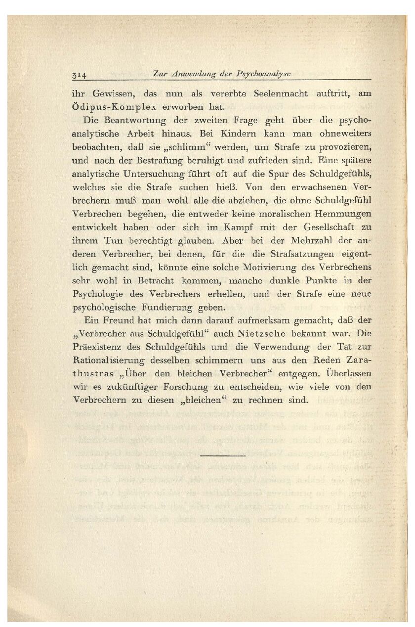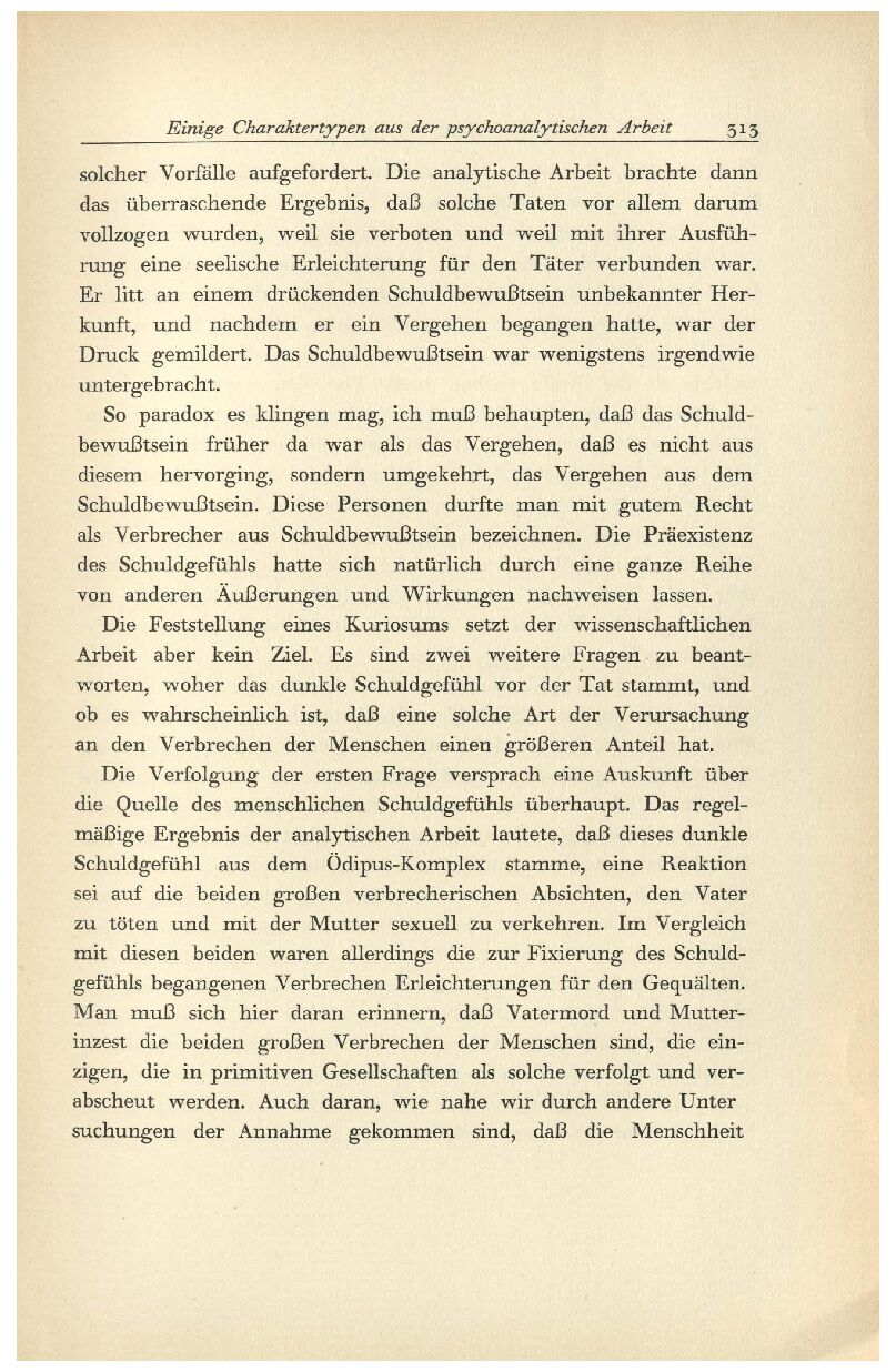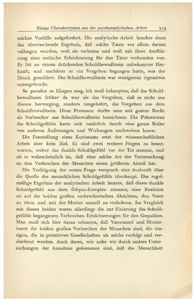 So paradox es klingen mag, ich muß behaupten, daß das Schuldbewußtsein früher da war als das Vergehen, daß es nicht aus diesem hervorging, sondern umgekehrt das Vergehen aus dem Schuldbewußtsein. Diese Personen durfte man mit gutem Recht als Verbrecher aus Schuldbewußtsein bezeichnen. Die Präexistenz des Schuldgefühls hatte sich natürlich durch eine ganze Reihe von anderen Äußerungen und Wirkungen nachweisen lassen.