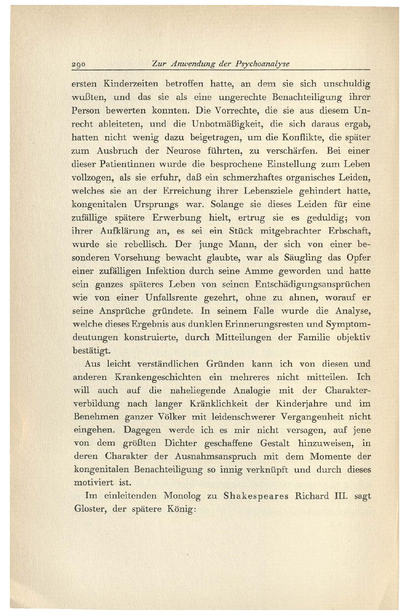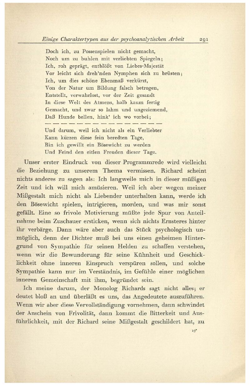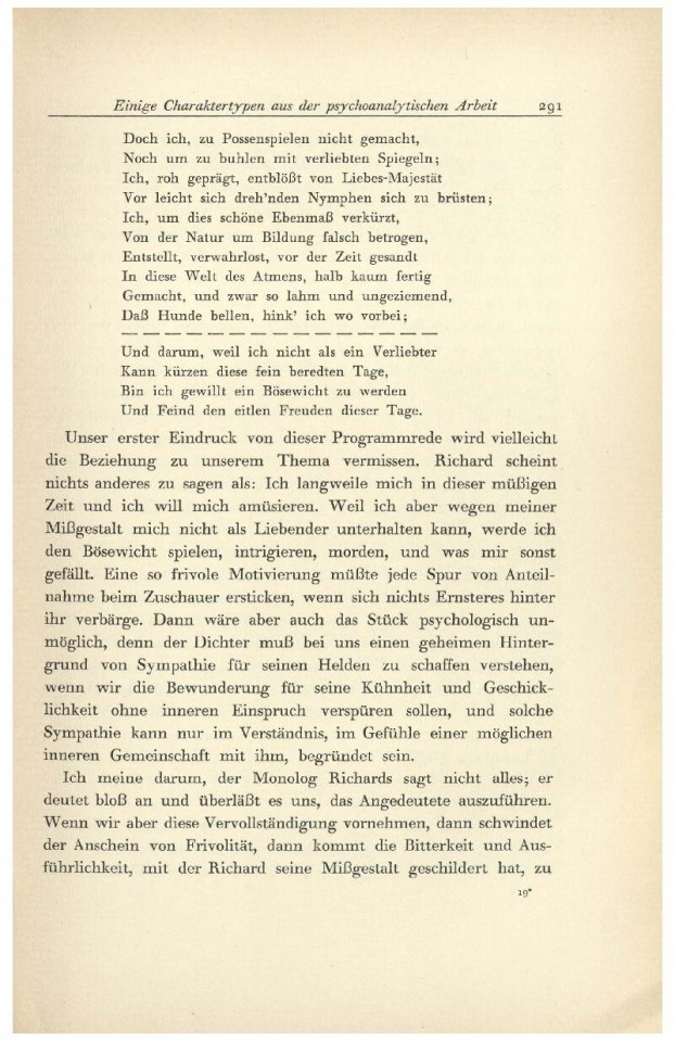 Aus leicht verständlichen Gründen kann ich von diesen und anderen Krankengeschichten ein mehreres nicht mitteilen. Ich will auch auf die naheliegende Analogie mit der Charakterverbildung nach langer Kränklichkeit der Kinderjahre und im Benehmen ganzer Völker mit leidenschwerer Vergangenheit nicht eingehen. Dagegen werde ich es mir nicht versagen, auf jene von dem größten Dichter geschaffene Gestalt hinzuweisen, in deren Charakter der Ausnahmsanspruch mit dem Momente der kongenitalen Benachteiligung so innig verknüpft und durch dieses motiviert ist.