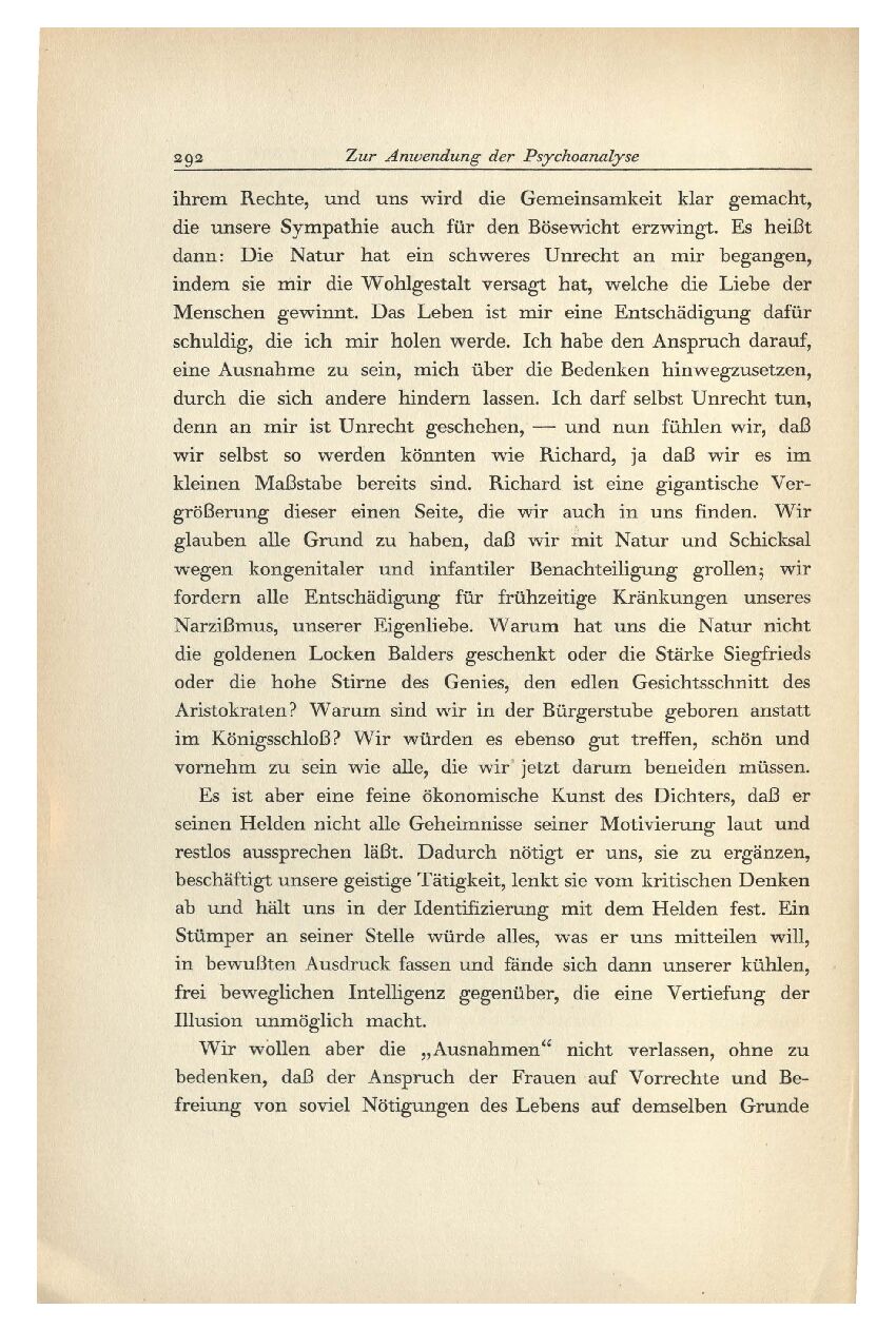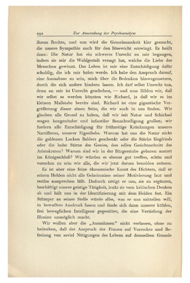 ihrem Rechte, und uns wird die Gemeinsamkeit klargemacht, die unsere Sympathie auch für den Bösewicht erzwingt. Es heißt dann: Die Natur hat ein schweres Unrecht an mir begangen, indem sie mir die Wohlgestalt versagt hat, welche die Liebe der Menschen gewinnt. Das Leben ist mir eine Entschädigung dafür schuldig, die ich mir holen werde. Ich habe den Anspruch darauf, eine Ausnahme zu sein, mich über die Bedenken hinwegzusetzen, durch die sich andere hindern lassen. Ich darf selbst Unrecht tun, denn an mir ist Unrecht geschehen – und nun fühlen wir, daß wir selbst so werden könnten wie Richard, ja daß wir es im kleinen Maßstabe bereits sind. Richard ist eine gigantische Vergrößerung dieser einen Seite, die wir auch in uns finden. Wir glauben alle Grund zu haben, daß wir mit Natur und Schicksal wegen kongenitaler und infantiler Benachteiligung grollen; wir fordern alle Entschädigung für frühzeitige Kränkungen unseres Narzißmus, unserer Eigenliebe. Warum hat uns die Natur nicht die goldenen Locken Balders geschenkt oder die Stärke Siegfrieds oder die hohe Stirne des Genies, den edlen Gesichtsschnitt des Aristokraten? Warum sind wir in der Bürgerstube geboren anstatt im Königsschloß? Wir würden es ebensogut treffen, schön und vornehm zu sein wie alle, die wir jetzt darum beneiden müssen.