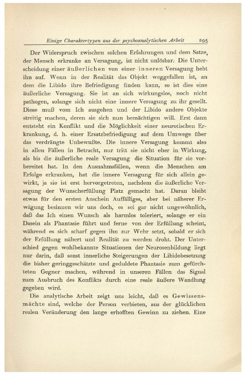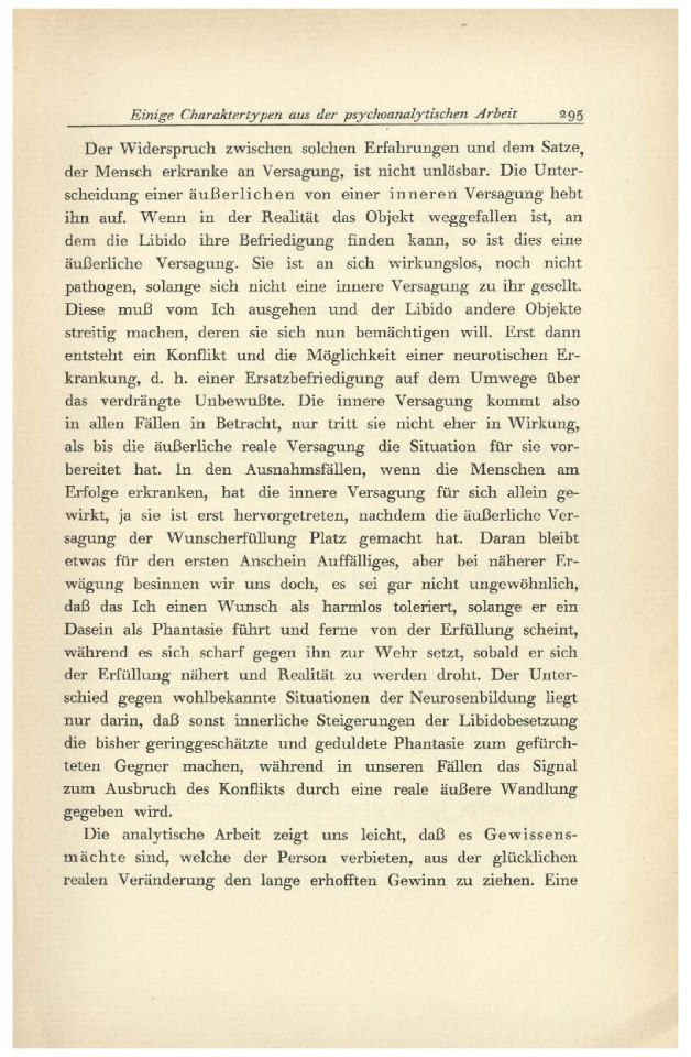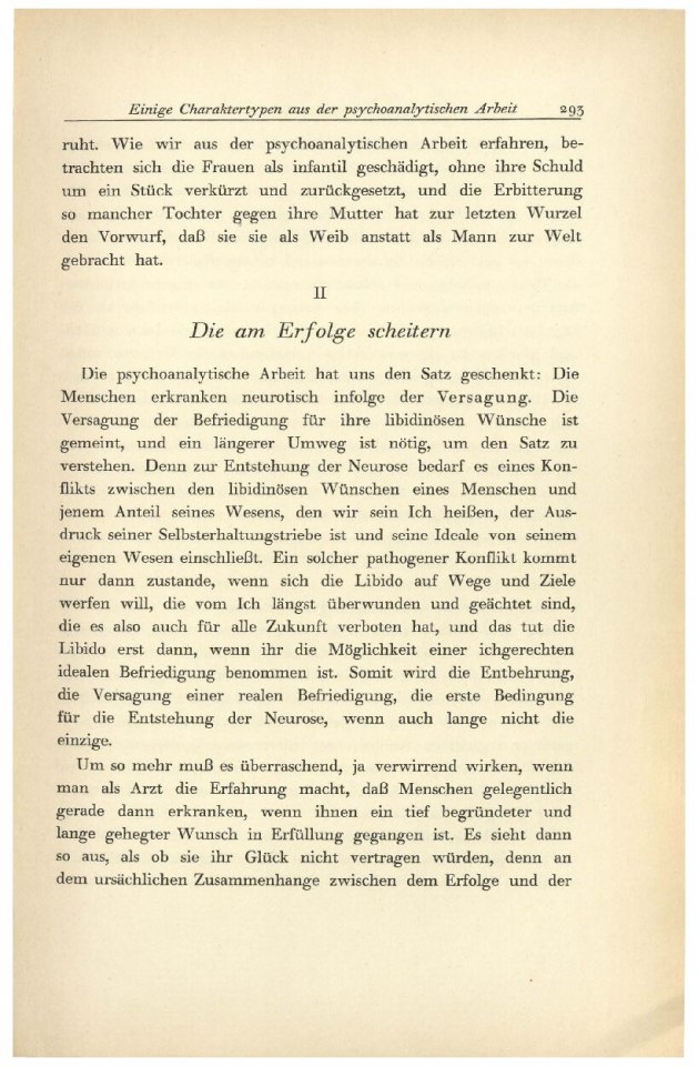 Die am Erfolge scheiternDie psychoanalytische Arbeit hat uns den Satz geschenkt: Die Menschen erkranken neurotisch infolge der Versagung. Die Versagung der Befriedigung für ihre libidinösen Wünsche ist gemeint, und ein längerer Umweg ist nötig, um den Satz zu verstehen. Denn zur Entstehung der Neurose bedarf es eines Konflikts zwischen den libidinösen Wünschen eines Menschen und jenem Anteil seines Wesens, den wir sein Ich heißen, der Ausdruck seiner Selbsterhaltungstriebe ist und seine Ideale von seinem eigenen Wesen einschließt. Ein solcher pathogener Konflikt kommt nur dann zustande, wenn sich die Libido auf Wege und Ziele werfen will, die vom Ich längst überwunden und geächtet sind, die es also auch für alle Zukunft verboten hat, und das tut die Libido erst dann, wenn ihr die Möglichkeit einer ichgerechten idealen Befriedigung benommen ist. Somit wird die Entbehrung, die Versagung einer realen Befriedigung, die erste Bedingung für die Entstehung der Neurose, wenn auch lange nicht die einzige.