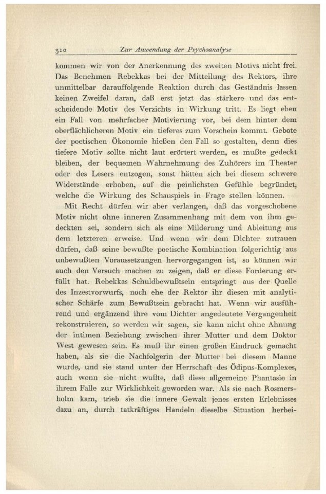 Mit Recht dürfen wir aber verlangen, daß das vorgeschobene Motiv nicht ohne inneren Zusammenhang mit dem von ihm gedeckten sei, sondern sich als eine Milderung und Ableitung aus dem letzteren erweise. Und wenn wir dem Dichter zutrauen dürfen, daß seine bewußte poetische Kombination folgerichtig aus unbewußten Voraussetzungen hervorgegangen ist, so können wir auch den Versuch machen zu zeigen, daß er diese Forderung erfüllt hat. Rebekkas Schuldbewußtsein entspringt aus der Quelle des Inzestvorwurfs, noch ehe der Rektor ihr diesen mit analytischer Schärfe zum Bewußtsein gebracht hat. Wenn wir ausführend und ergänzend ihre vom Dichter angedeutete Vergangenheit rekonstruieren, so werden wir sagen, sie kann nicht ohne Ahnung der intimen Beziehung zwischen ihrer Mutter und dem Doktor West gewesen sein. Es muß ihr einen großen Eindruck gemacht haben, als sie die Nachfolgerin der Mutter bei diesem Manne wurde, und sie stand unter der Herrschaft des Ödipus-Komplexes, auch wenn sie nicht wußte, daß diese allgemeine Phantasie in ihrem Falle zur Wirklichkeit geworden war. Als sie nach Rosmersholm kam, trieb sie die innere Gewalt jenes ersten Erlebnisses dazu an, durch tatkräftiges Handeln dieselbe Situation herbeizuführen,