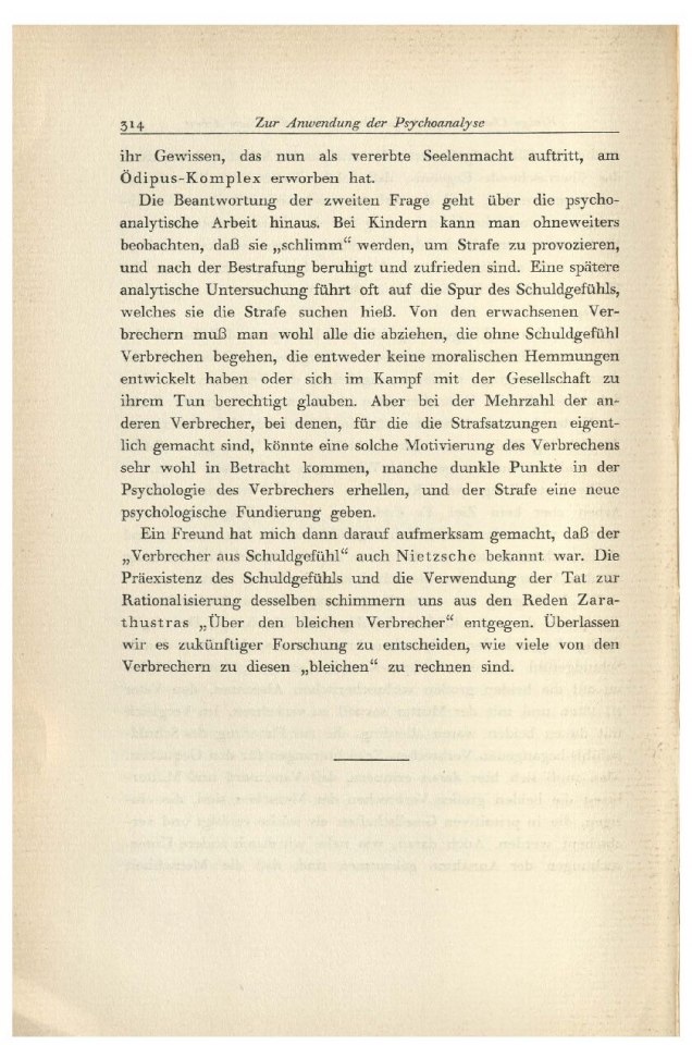 Ein Freund hat mich dann darauf aufmerksam gemacht, daß der »Verbrecher aus Schuldgefühl« auch Nietzsche bekannt war. Die Präexistenz des Schuldgefühls und die Verwendung der Tat zur Rationalisierung desselben schimmern uns aus den Reden Zarathustras »Über den bleichen Verbrecher« entgegen. Überlassen wir es zukünftiger Forschung zu entscheiden, wieviele von den Verbrechern zu diesen »bleichen« zu rechnen sind.