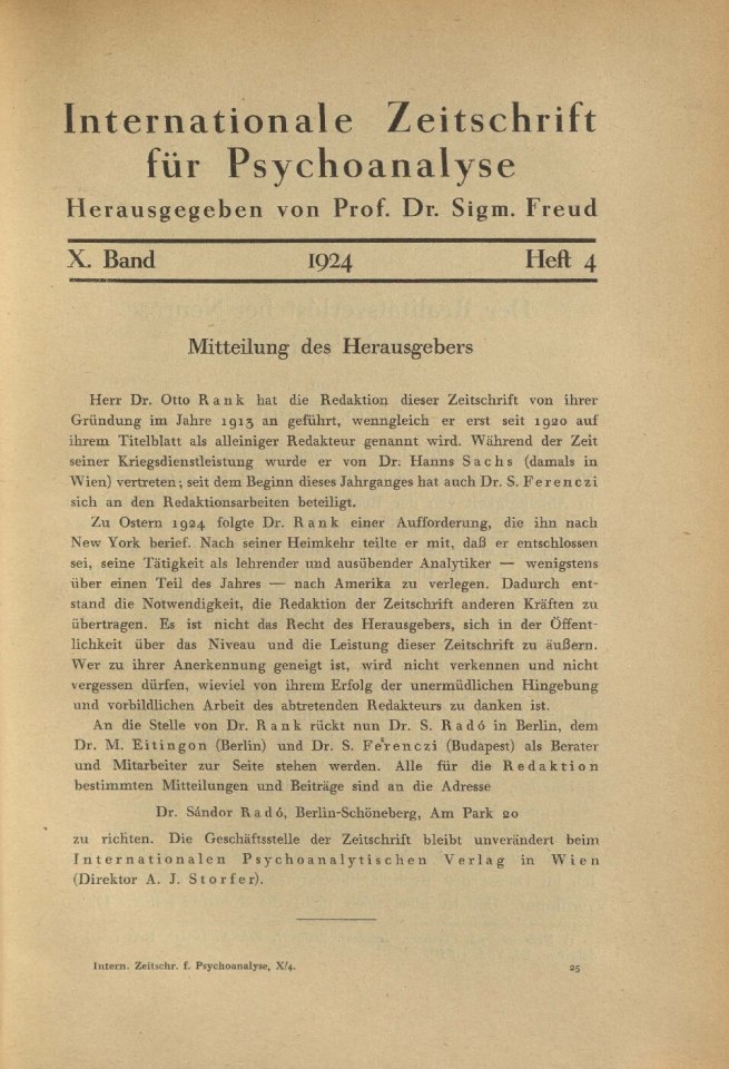Mitteilung des Herausgebers [›Internationale Zeitschrift für Psychoanalyse‹]