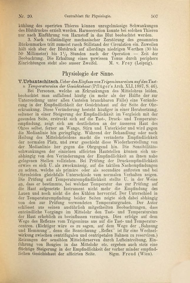 Freud, Sigmund 1887-243/1887 Rezension von: Urbantschitsch, V[ictor] ›Über den Einfluß von Trigeminusreizen auf den Tast- u. Temperatursinn der Gesichtshaut‹ Centralblatt für Physiologie, 1, 1887, 20 507 Fertig Fertig Ganz fertig / zutreffend Fehlt Fehlt Ganz fertig / zutreffend EB