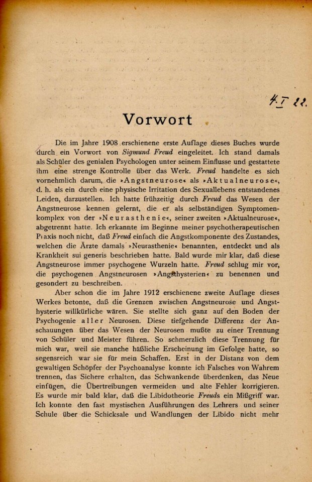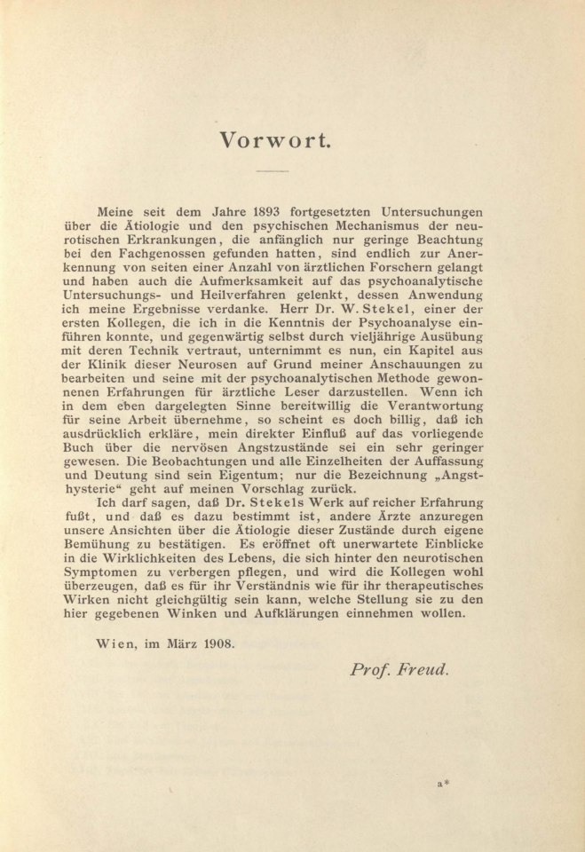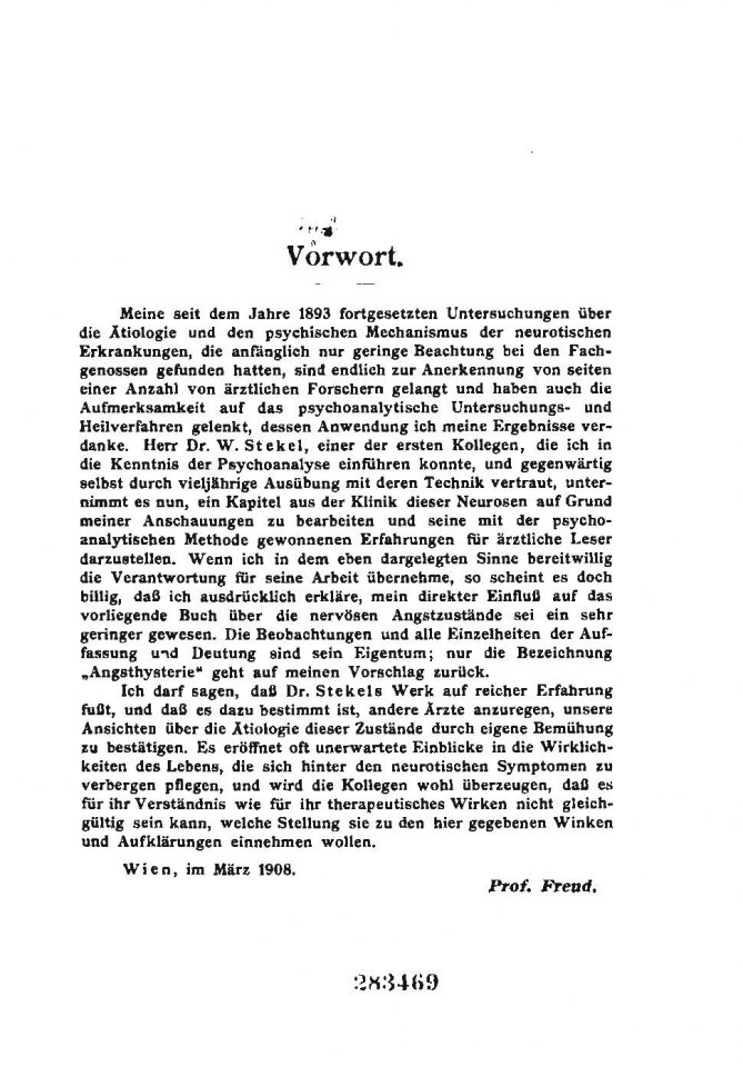 Freud, Sigmund 1908-061/1941 1908f 10639 Vorwort zu NERVÖSE ANGSTZUSTÄNDE UND IHRE BEHANDLUNG von Dr. Wilhelm Stekel, Verlag Urban & Schwarzenberg, Berlin und Wien 1908 GW 7 467–468 Fertig Nicht erforderlich/ Nicht erforderlich/ Nicht erforderlich/ Nicht erforderlich/ Nicht erforderlich/
