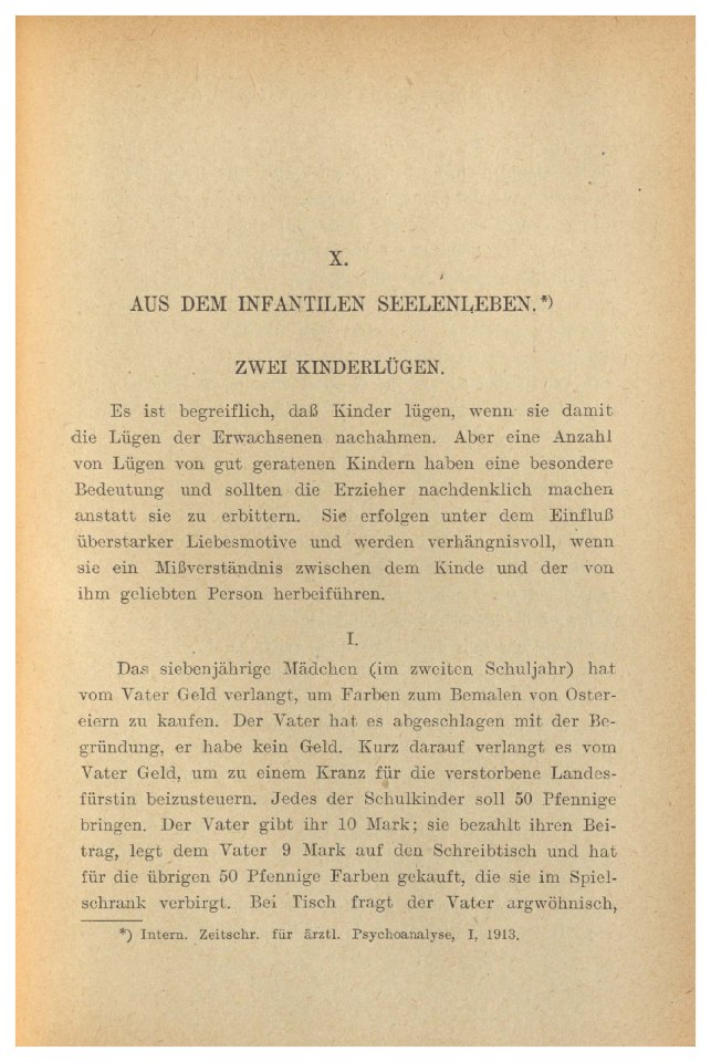 Freud, Sigmund | 1913-008/1922 | 10659 | Zwei Kinderlügen | SKSN 4 (2. Auflage) | 189–194 | Fertig ✔ | Fertig ✔ | Ganz fertig / zutreffend ✔ | Fehlt ✖ | Fehlt ✖ | Ganz fertig / zutreffend ✔ | ✔ | EB | ✔ |