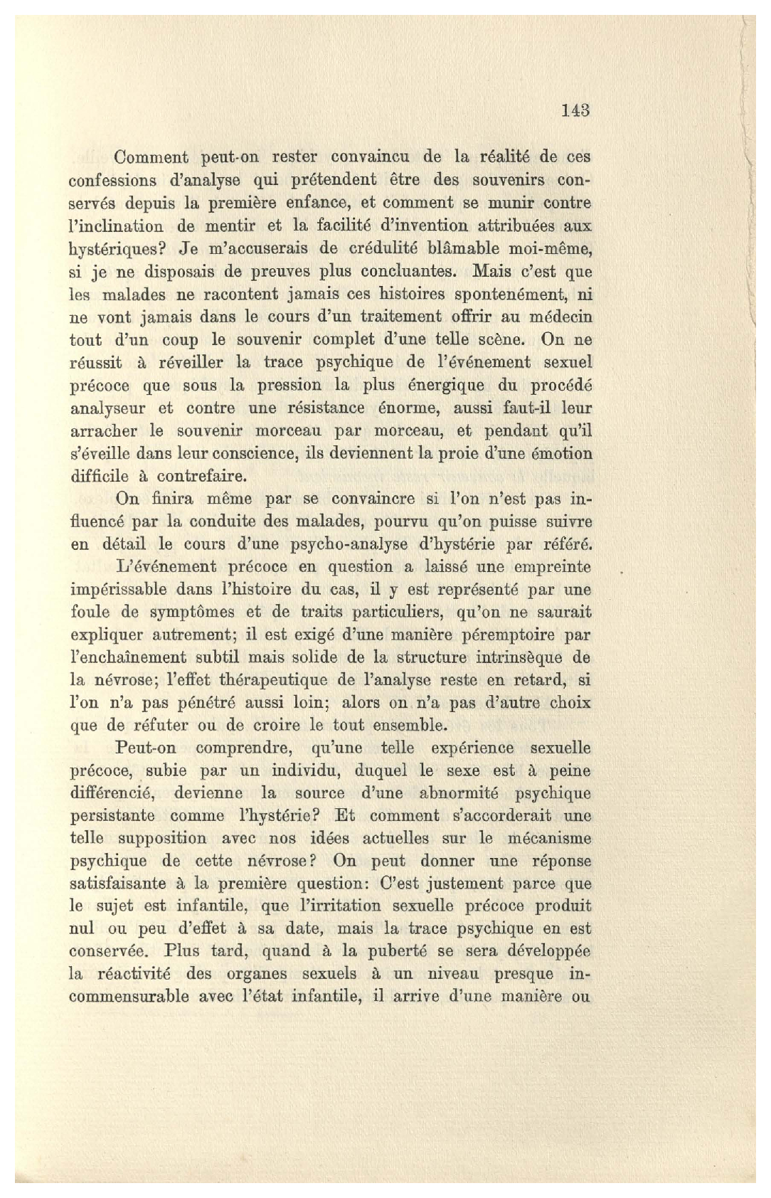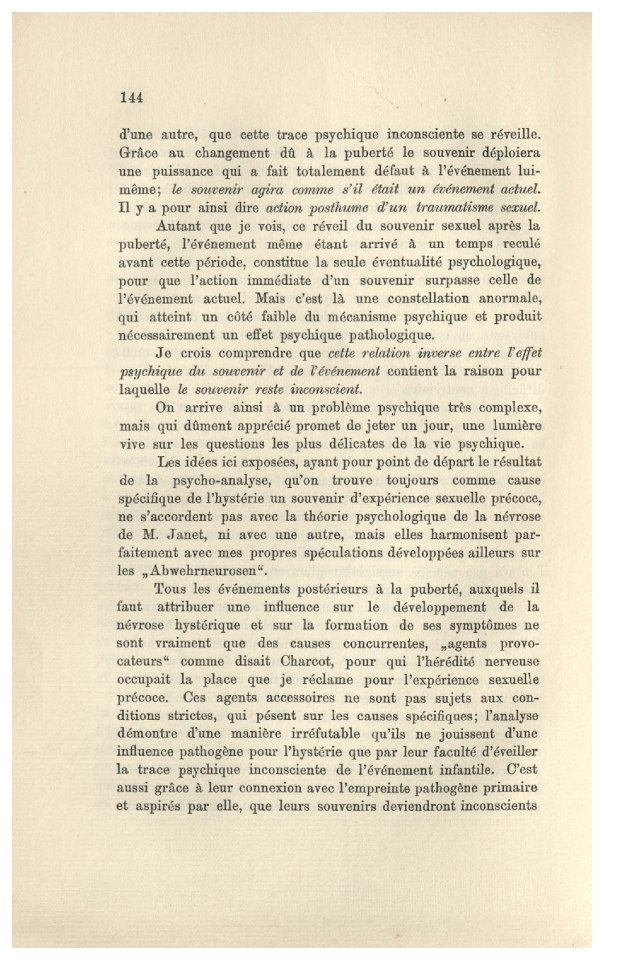 Il y a pour ainsi dire action posthume d'un traumatisme sexuel.Autant que je vois, ce réveil du souvenir sexuel après la