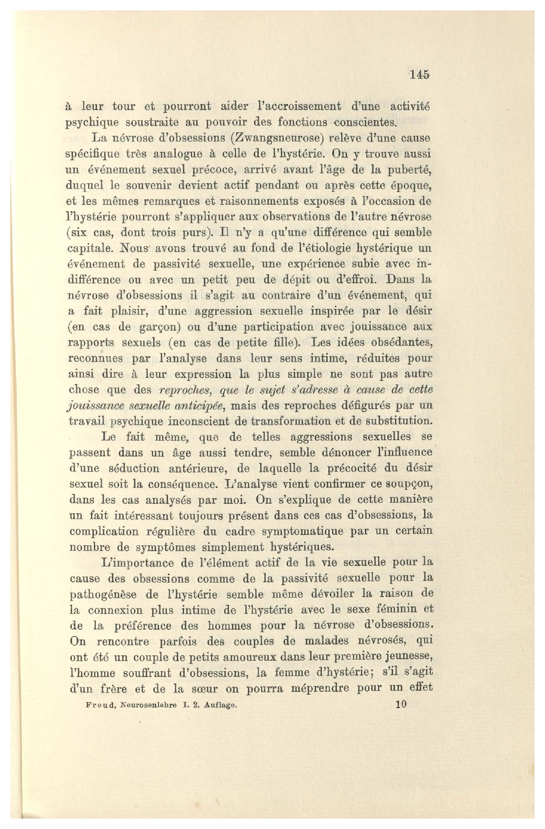 psychique soustraite au pouvoir des fonctions conscientes.La névrose d’obsessions (Zwangsneurose) relève d’une cause
