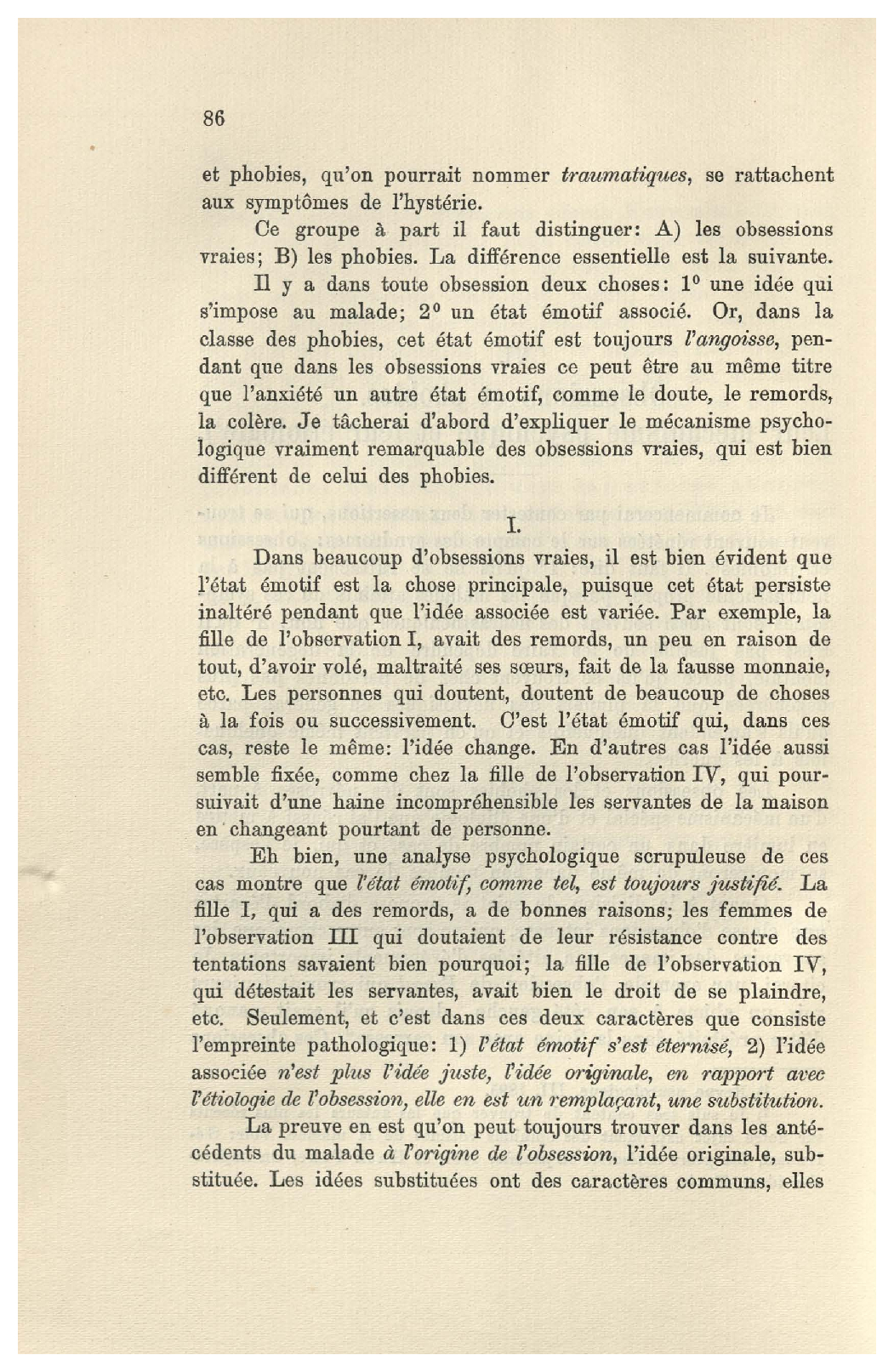 vraies; B) les phobies. La différence essentielle est la suivante.Il y a dans toute obsession deux choses: ⑩ une idée qui