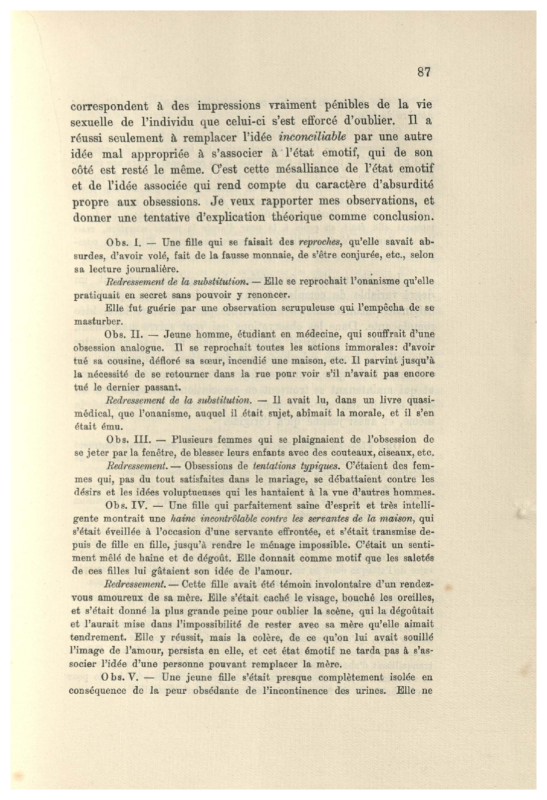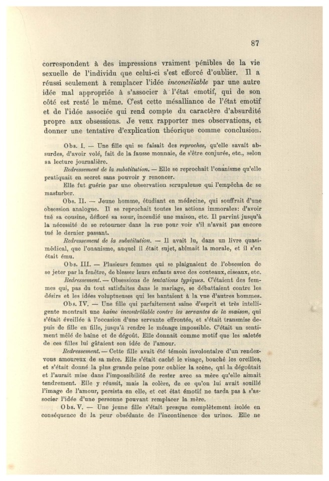 donner une tentative d’explication théorique comme conclusion.Obs. I, 一 Une fille qui se faisait des reproches, qu’elle savait ab-