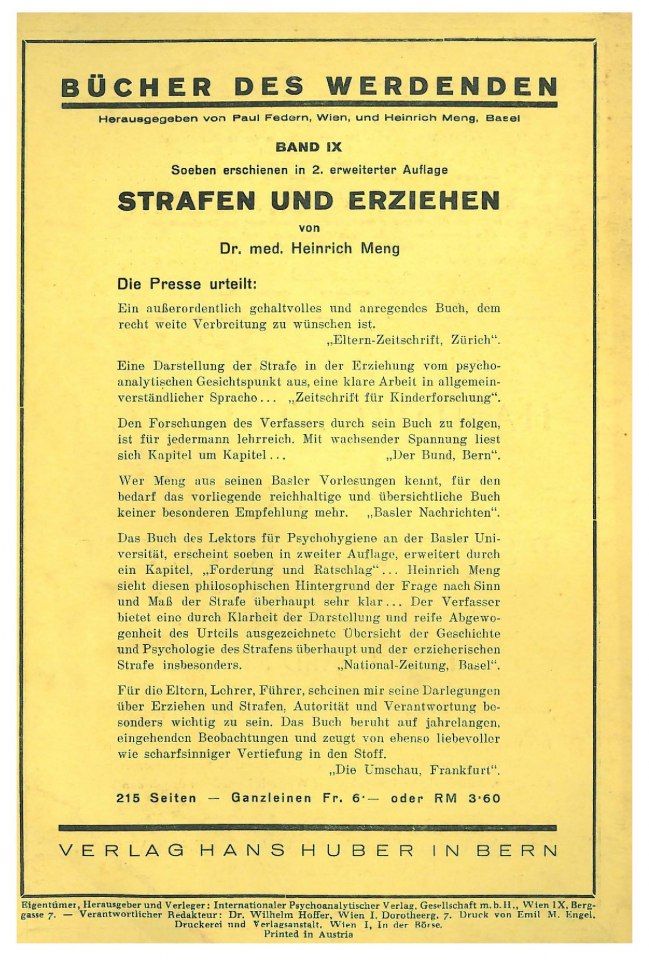 Eigentümer, Herausgeber und Verleger: Internationaler Psychoanalytischer Verlag, Gesellschaft m. b. H., Wien IX, Berggasse 7. — Verantwortlicher Redakteur: Dr. Wilhelm Hoffer, Wien I, Dorotheerg. 7. Druck von Emil M. Engel, Druckerei und Verlagsanstalt, Wien I, In der Börse.