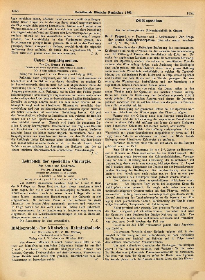 Rezension [gezeichnet: "F."] von: Huber, J., Ch. ›Bibliographie der klinischen Helminthologie‹ 1893-203/1893