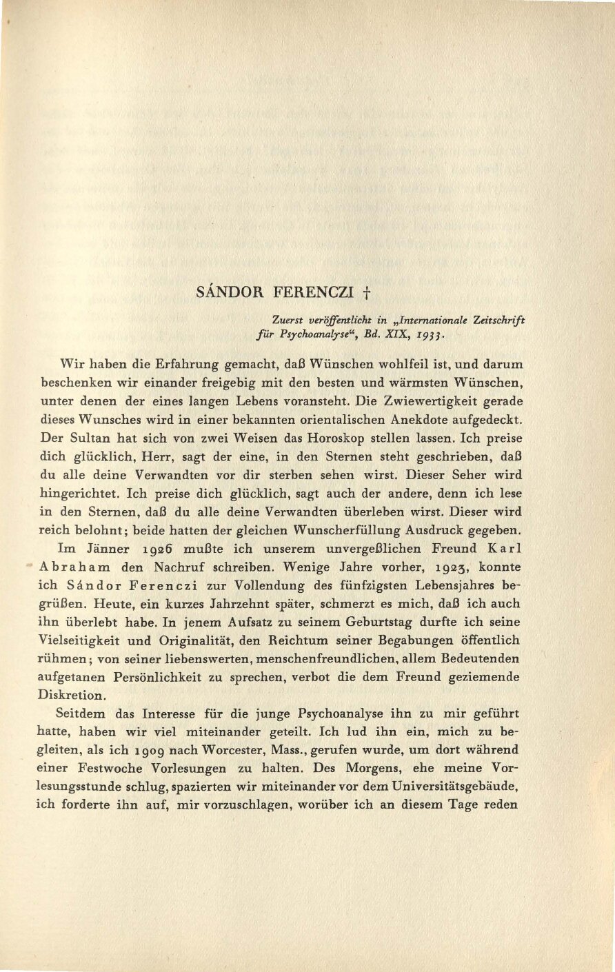 ich Sándor Ferenczi zur Vollendung des fünfzigsten Lebensjahres be-