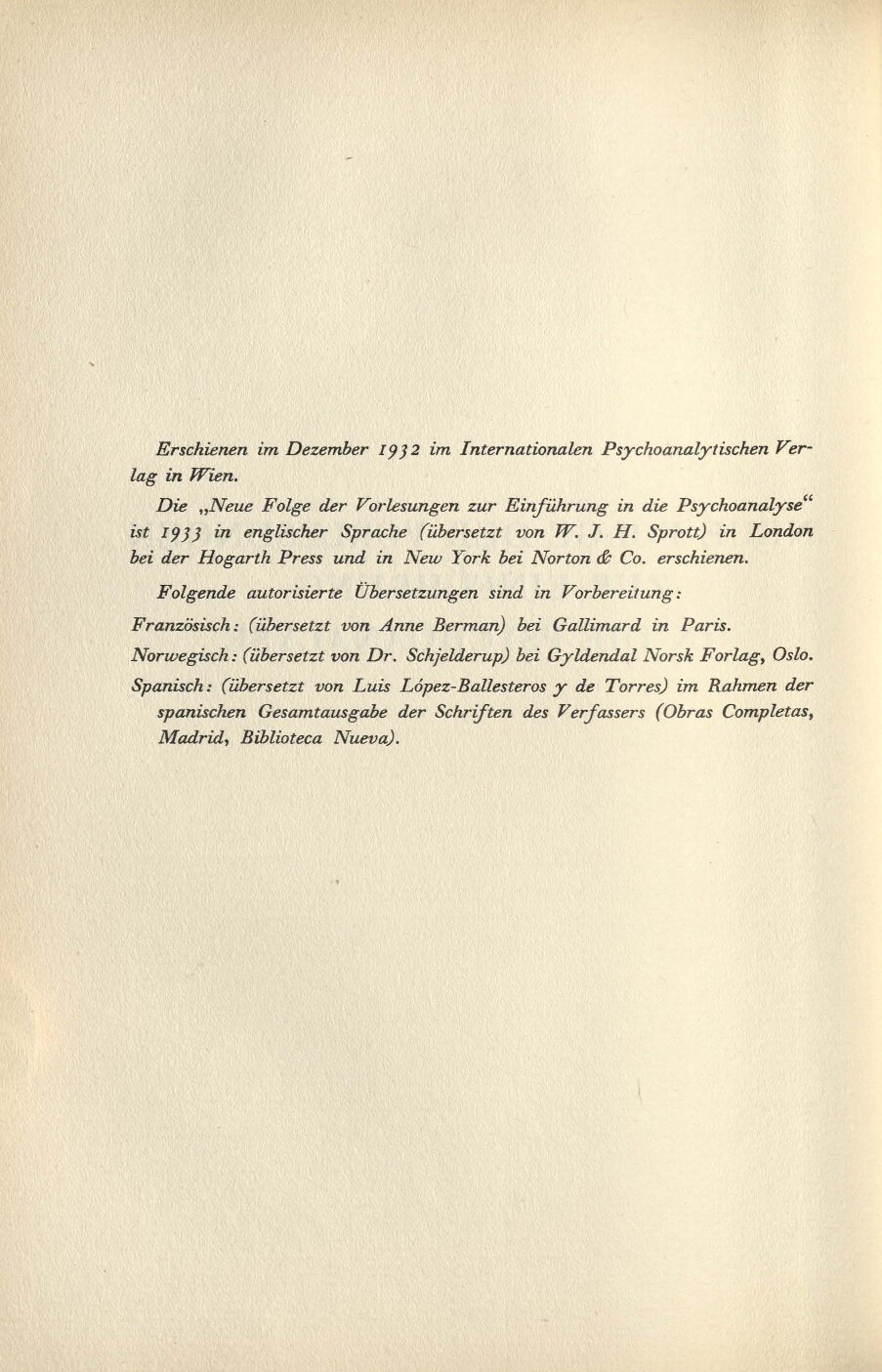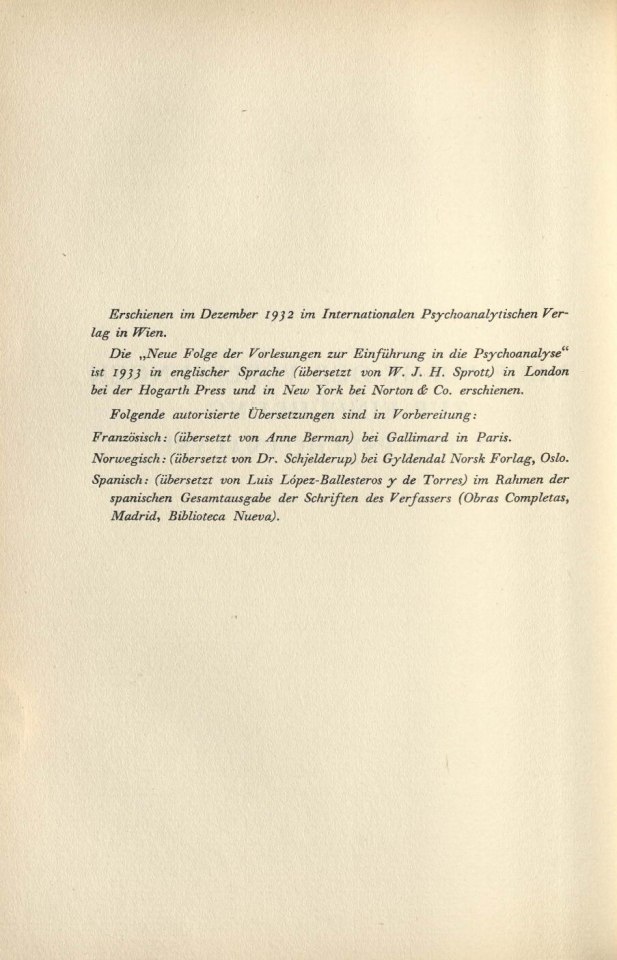 Neue Folge der Vorlesung zur Einführung in die Psychoanalyse/1934 /1934: Neue Folge der Vorlesung zur Einführung in die PsychoanalyseTitelVorwortXXIX. Revision der TraumlehreXXX. Traum und OkkultismusXXXI. Die Zerlegung der psychischen PersönlichkeitXXXII. Angst und TrieblebenXXXIII. Die WeiblichkeitXXXIV. Aufklärungen, Anwendungen, OrientierungenXXXV. Über eine Weltanschauung S. S. Komponente Titelblatt Art der Manifestation Druckschrift Medientyp Papier Referenztext Nein TEI Export abgeschlossen Nein Format Buch Schriftart Druckschrift Sprache Deutsch Zustand Unbeschädigt Original/Kopie Original Archiv, Bibliothek IPU Weiterführende Informationen Publikationsart Text in Werkausgabe AutorInnen Freud, Sigmund Seitenzahl von/bis 149 – 150
