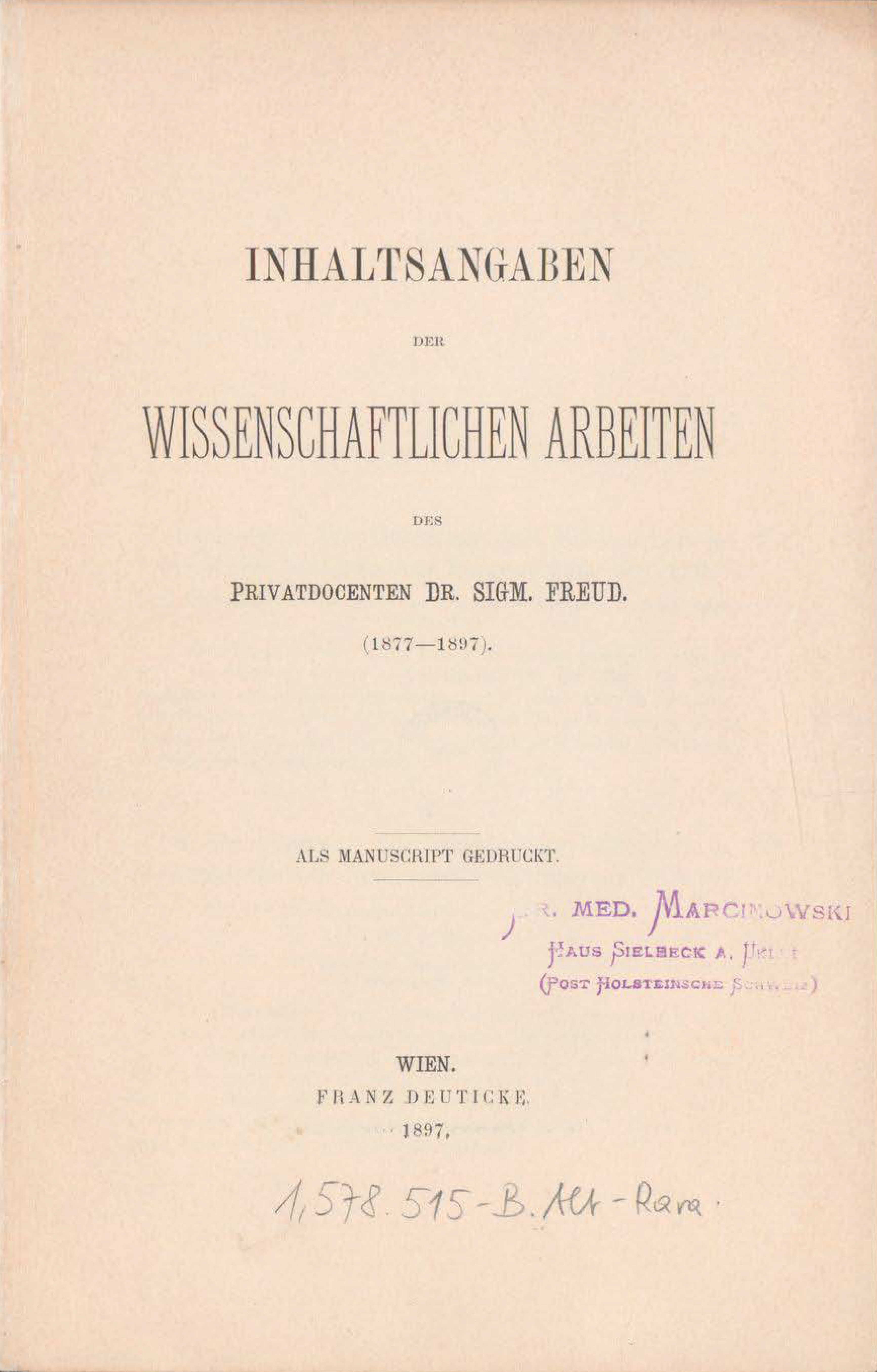Inhaltsangaben der wissenschaftlichen Arbeiten des Privatdocenten Dr. Sigm. Freud. (1877-1897)/1897 /1897: Inhaltsangaben der wissenschaftlichen Arbeiten des Privatdocenten Dr. Sigm. Freud. (1877-1897)Einband (Broschur)TitelblattA. Vor Erlangung der DocenturB. Seit Erlangung der Docentur S. S. Komponente Titelblatt Jahr der Niederschrift/Publikation 1897 Art der Manifestation Druckschrift Medientyp Papier Referenztext Nein TEI Export abgeschlossen Nein Format Buch Schriftart Druckschrift Sprache Deutsch Zustand Unbeschädigt Original/Kopie Original Archiv, Bibliothek IPU Weiterführende Informationen Publikationsart Text in Werkausgabe AutorInnen Freud, Sigmund