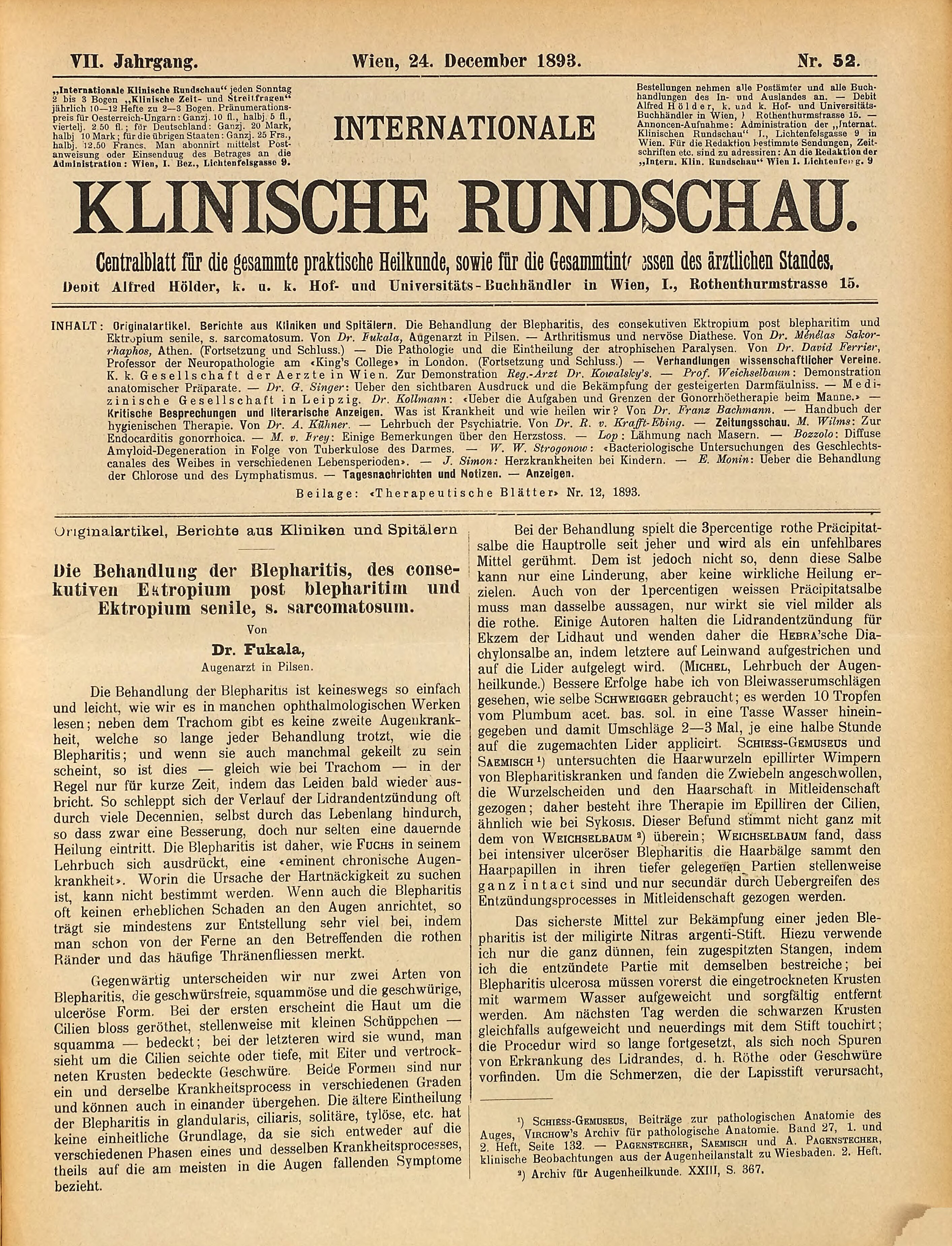 Referirt nach den Vorträgen, gehalten im Wiener medicinischen Club. Beiträge zur Lehre von den hysterischen Lähmungen. K. k. Gesellschaft der Aerzte in Wien. Zur Demonstration Reg.-Arzt Dr. K. Kowalsky: Ueber Wechselstroms-Demonstration. — Chirurgie: Ueber die Therapie der Diphtherie. Von Dr. S. Heldesheimer in Berlin. Zur Therapie der Ovaritis. Von Dr. H. Heinrichius in Debreczin. — Geburtshülfe und Gynäkologie: Prof. Kahlbaum: Ueber die Aufgaben und Grenzen der Chemotherapie beim Manne. — Medicinisches Gesellschaft in Leipzig. Dr. H. Goldschmidt: Die Chemotherapie beim Manne. — Pathologie: Beiträge zur Lehre von der traumatischen Hysterie. Von Dozent Freud. Die Aetiologie der syphilitischen Erkrankung. Vom Königl. sächsischen Sanitätsbericht. Von Dr. G. Grützner in Berlin. Zur Casuistik des Magenkrebses. Von Prof. Dr. E. Maragliano in Genua. — Ueber Amyloid-Degeneration in Folge von Tuberculose des Darms. Von Dr. H. Strempel. — Bacteriologische Untersuchungen des Geschlechtsapparates der Frauen. Von Dr. H. Thränhoffer in Debreczin. — Ueber die Behandlung von Scabies. Von Dr. H. Strempel. — Ueber die Vergiftung durch Chloroform. Von Dr. H. Strempel. — Pharmaceutik: Salol und seine Wirkung auf die Nerven. — Ueber die Anwendung der Chloroese und des Lymphatismus. — Ueber Arsenik auf den experimentellen Diabetes. Bauerdt: Ueber eine Fall von Akromegalie mit Autopsie. Laucettella (Mailand): Ueber die Behandlung von Arteriosklerose. Tagesnachrichten und Notizen. Anzeigen.