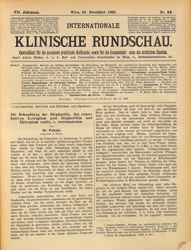 INHALT: Originalartikel, Berichte aus Kliniken und Spitälern. Die Behandlung des Blepharitis, des consecutiven Exstropium pal. Blepharitis und