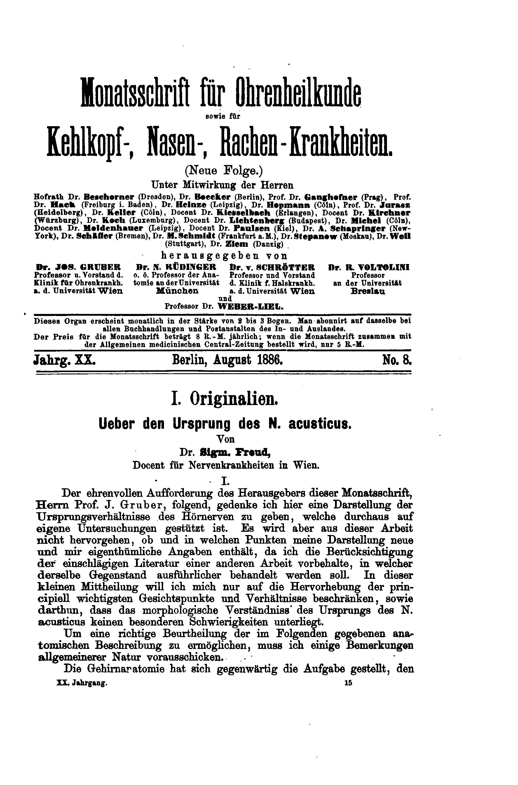 Der ehrenvollen Aufforderung des Herausgebers dieser Monatsschrift, Herrn Prof. J. G r u b e r , folgend, gedenke ich hier eine Darstellung der Ur- sprungsverhältnisse des Hörnerven zu geben, welche durchaus auf eigene Un- tersuchungen gestützt ist. Es wird aber aus dieser Arbeit nicht hervorgehen, ob und in welchen Punkten meine Darstellung neue und mir eigenthümliche Angaben enthält, da ich die Berücksichtigung der einschlägigen Literatur ei- ner anderen Arbeit vorbehalte, in welcher derselbe Gegenstand ausführlicher behandelt werden soll. In dieser kleinen Mittheilung will ich mich nur auf die Hervorhebung der principiell wichtigsten Gesichtspunkte und Verhältnisse beschränken, sowie darthun, dass das morphologische Verständniss des Ur- sprungs des N. acusticus keinen besonderen Schwierigkeiten unterliegt.