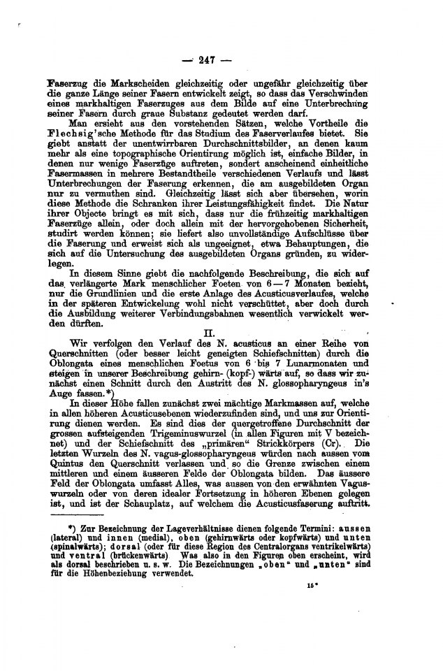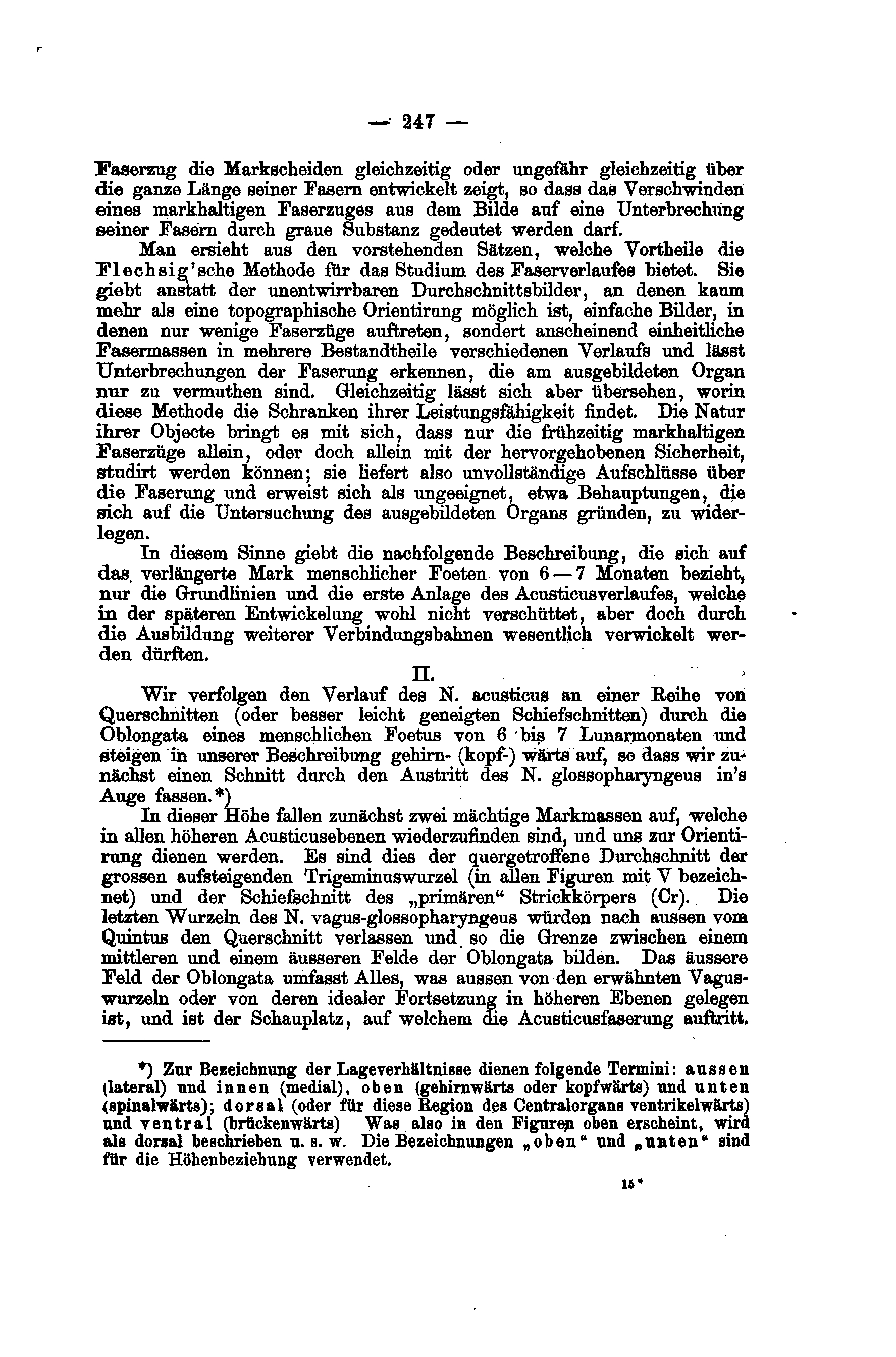 Man hat sich in letzterer Zeit entschieden, diesen letzteren Methoden grosses Zutrauen zu schenken, und dabei vielfach über die Grenzen deren Leistungsfähigkeit hinweggesehen, hingegen die rein anatomische Verfolgung des Faserverlaufes, deren Schwierigkeiten sehr viel augenfälliger sind, in den Hintergrund gedrängt. Die directe Verfolgung des Faserverlaufes steht aber hinter keiner anderen Methode der Gehirnanatomie zurück, wenn sie nach dem Beispiele F l e c h s i g ’ s nicht am ausgebildeten, sondern am in der Entwickelung begriffenen Objecte vorgenommen wird, und dieser Methode habe ich mich auch bei den Untersuchungen über den Ursprung des Hör- nerven ausschliesslich bedient.