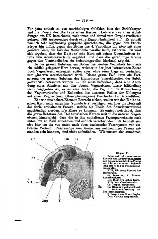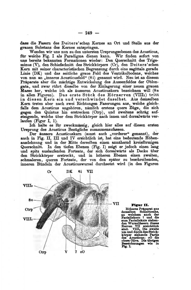 Wenden wir uns nun zu den untersten Ursprungsebenen des Acusticus, für welche Fig. I als Paradigma dienen kann. Wir finden sofort von uns bereits bekannten Formationen wieder: Den Querschnitt des Trigeminus (V), den Schiefschnitt des Strickkörpers (Cr), den D e i t e r s ’ schen Kern mit sei- ner characteristischen Begrenzung durch eine sagittale gerade Linie (DK) und das seitliche graue Feld des Ventrikelbodens, welches von nun an „in- neres Acusticusfeld“ (8i) genannt wird. Neu ist an diesem Präparate aber die mächtige Entwickelung des Aussenfeldes der Oblongata, und zwar rührt dieselbe von der Einlagerung einer neuen grauen Masse her, welche ich als äusseren Acusticuskern bezeichnen will (8e in allen Figuren). D a s e r s t e S t ü c k d e s H ö r n e r v e n (VIII1) t r i t t i n d i e s e n K e r n e i n u n d v e r s c h w i n d e t d a s e l b s t . Aus demselben Kern treten aber nach zwei Richtungen Faserungen aus, welche gleichfalls dem Acusticus angehören, nämlich erstens quere Züge, die sich gegen den Quin- tus hin erstrecken (Ctrp), und zweitens schräg aufsteigende, welche über dem Strickkörper nach innen und dorsalwärts verlaufen (Figur I, 1).