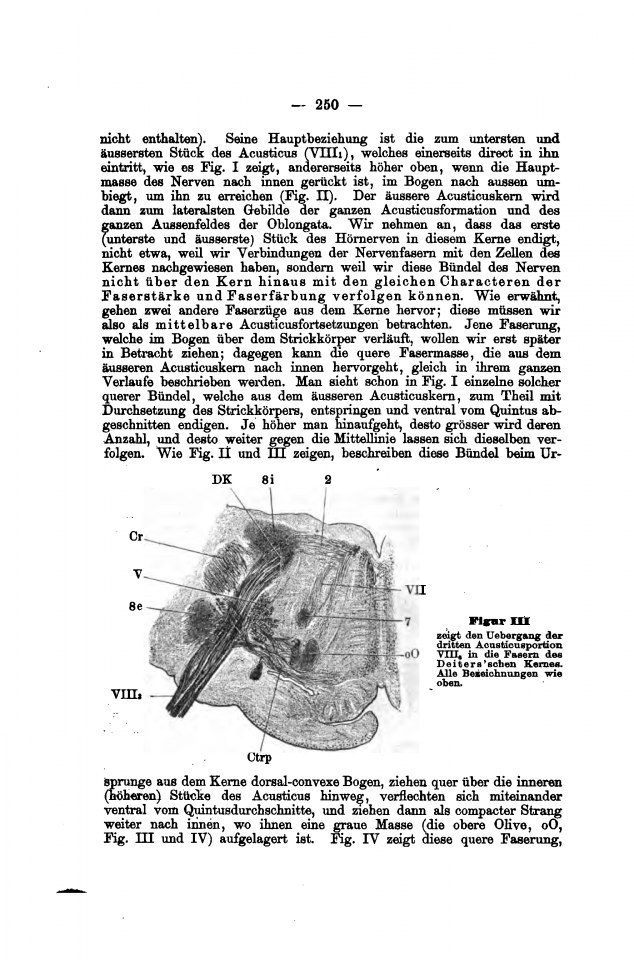 sprunge aus dem Kerne dorsal-convexe Bogen, ziehen quer über die inneren (höhe- ren) Stücke des Acusticus hinweg, verflechten sich miteinander ventral vom Quintusdurchschnitte, und ziehen dann als compacter Strang weiter nach innen, wo ihnen eine graue Masse (die obere Olive, oO, Fig. III und IV) aufgelagert ist. Fig. IV zeigt diese quere Faserung,