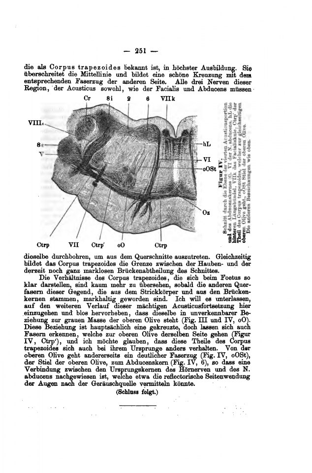 Die Verhältnisse des Corpus trapezoides, die sich beim Foetus so klar dar- stellen, sind kaum mehr zu übersehen, sobald die anderen Querfasern dieserGegend, die aus dem Strickkörper und aus den Brückenkernen stammen, markhaltig geworden sind. Ich will es unterlassen, auf den weiteren Verlauf dieser mächtigen Acusticusfortsetzung hier einzugehen und blos hervorhe- ben, dass dieselbe in unverkennbarer Beziehung zur grauen Masse der oberen Olive steht (Fig. III und IV, oO). Diese Beziehung ist hauptsächlich eine gekreuzte, doch lassen sich auch Fasern erkennen, welche zur oberen Olive derselben Seite gehen (Figur IV, Ctpr’ ), und ich möchte glauben, dass diese Theile des Corpus trapezoides sich auch bei ihrem Ursprunge anders verhal- ten. Von der oberen Olive geht andererseits ein deutlicher Faserzug (Fig. IV, oOSt), der Stiel der oberen Olive, zum Abducenskern (Fig. IV, 6), so dass eine Verbindung zwischen den Ursprungskernen des Hörnerven und des N. abducens nachgewiesen ist, welche etwa die reflectorische Seitenwendung der Augen nach der Geräuschquelle vermitteln könnte.