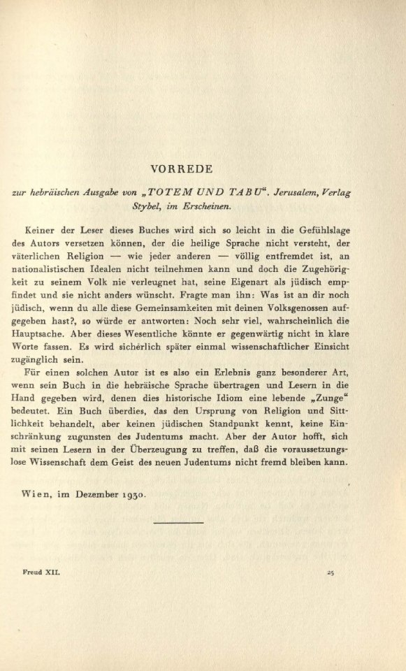 zur hebräischen Ausgabe von „TOTEM UND TABU“. Jerusalem, Verlag