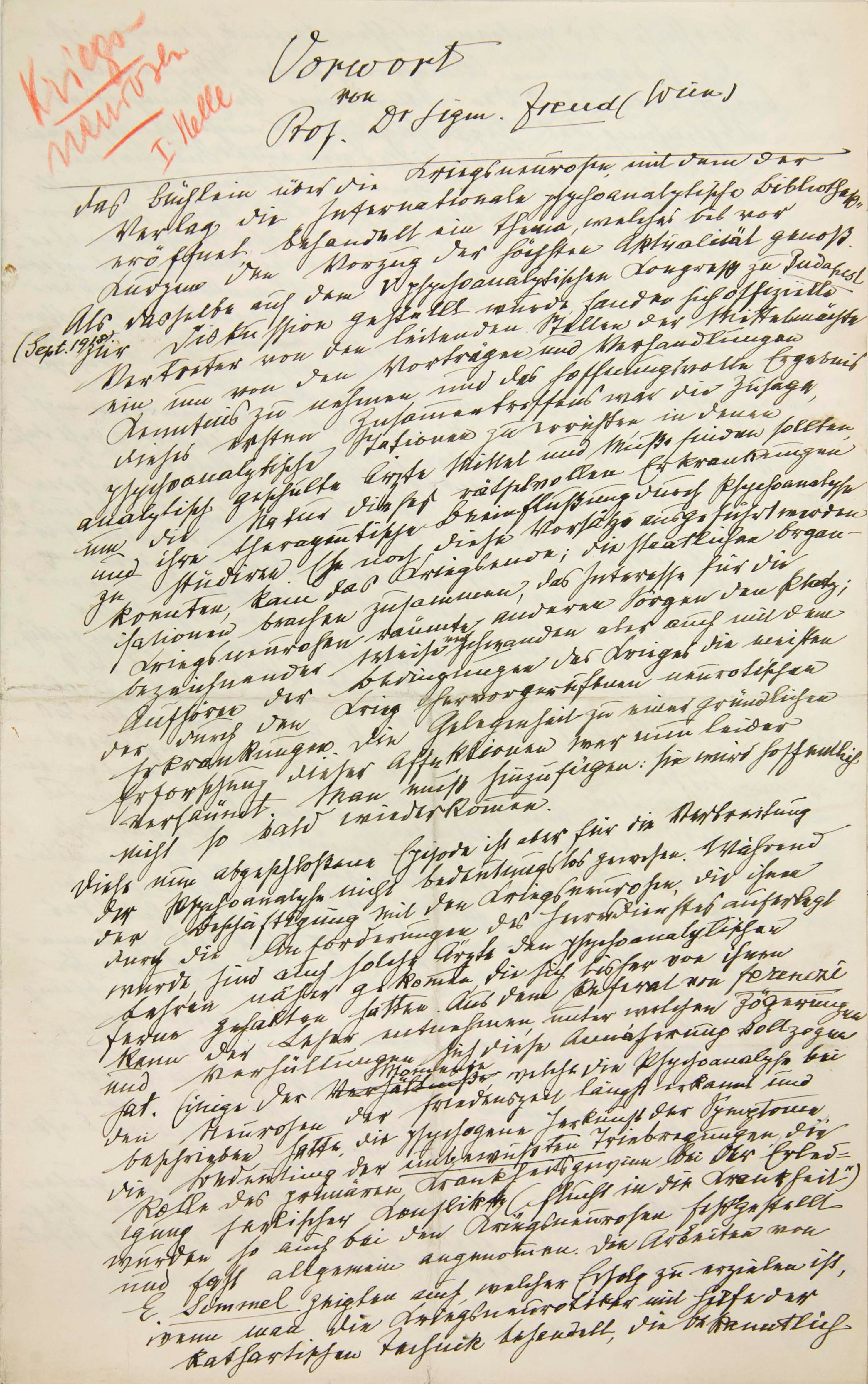Sigmund Freud Papers: Oversize, 1859-1985; Writings; 1919; "Vorwort" ["Einleitung zu Zur Psychoanalyse der Kriegsneurosen"] [d], holograph manuscript