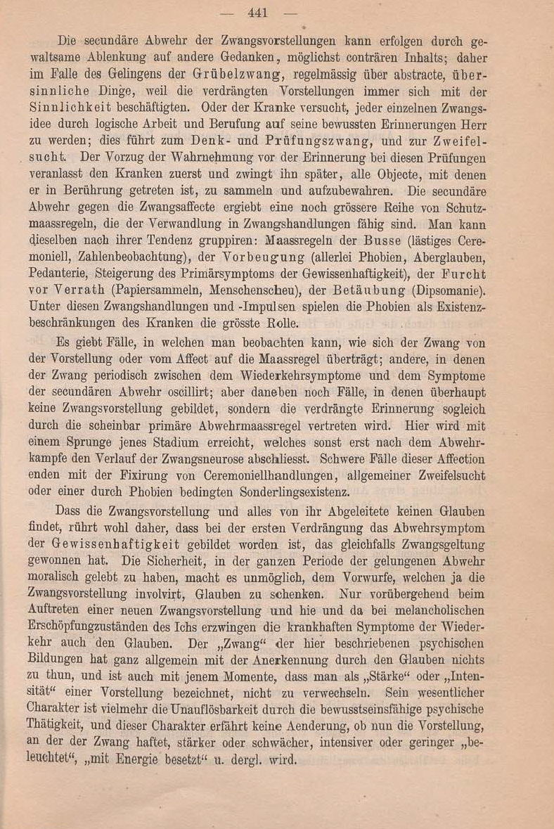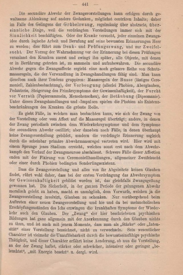 Die sekundäre Abwehr der Zwangsvorstellungen kann erfolgen durch gewaltsame Ablenkung auf andere Gedanken möglichst konträren Inhaltes; daher im Falle des Gelingens der Grübelzwang, regelmäßig über abstrakte, übersinnliche Dinge, weil die verdrängten Vorstellungen sich immer mit der Sinnlichkeit beschäftigten. Oder der Kranke versucht, jeder einzelnen Zwangsidee durch logische Arbeit und Berufung auf seine bewußten Erinnerungen Herr zu werden; dies führt zum Denk- und Prüfungszwange und zur Zweifelsucht. Der Vorzug der Wahrnehmung vor der Erinnerung bei diesen Prüfungen veranlaßt den Kranken zuerst und zwingt ihn später, alle Objekte, mit denen er in Berührung getreten ist, zu sammeln und aufzubewahren. Die sekundäre Abwehr gegen die Zwangsaffekte ergibt eine noch größere Reihe von Schutzmaßregeln, die der Verwandlung in Zwangshandlungen fähig sind. Man kann dieselben nach ihrer