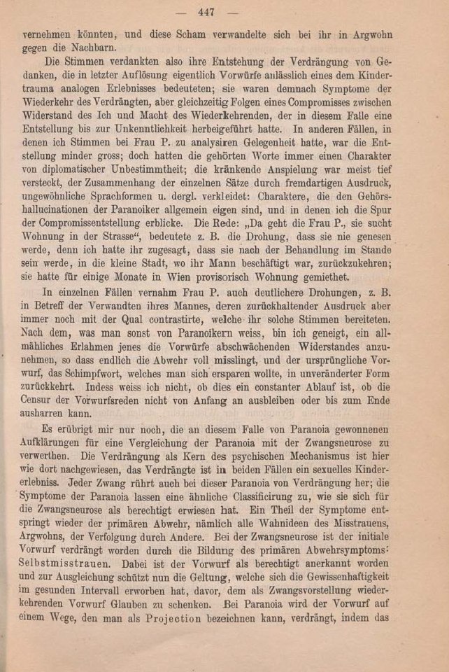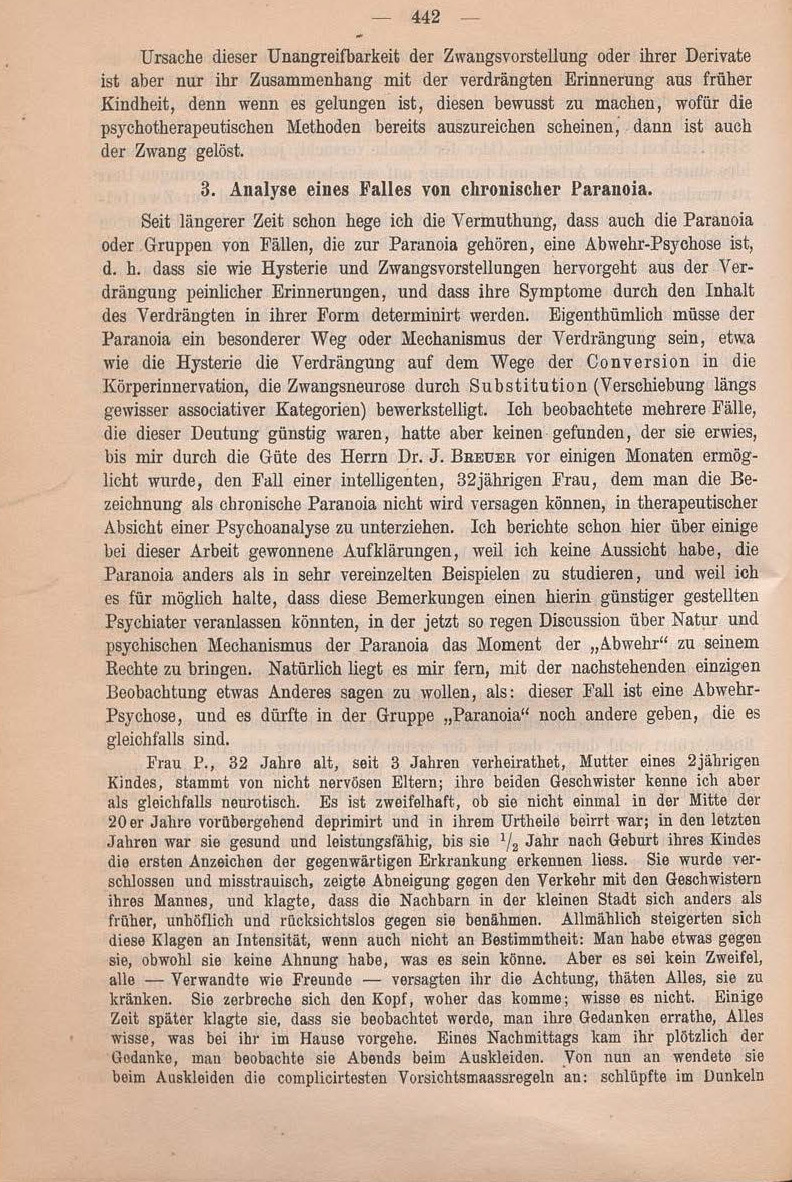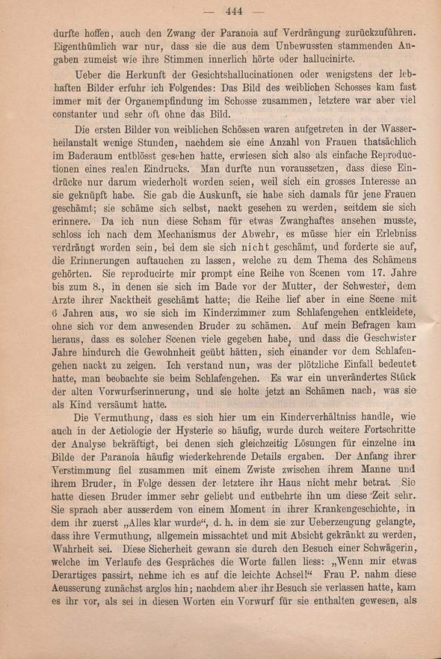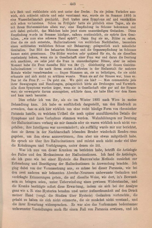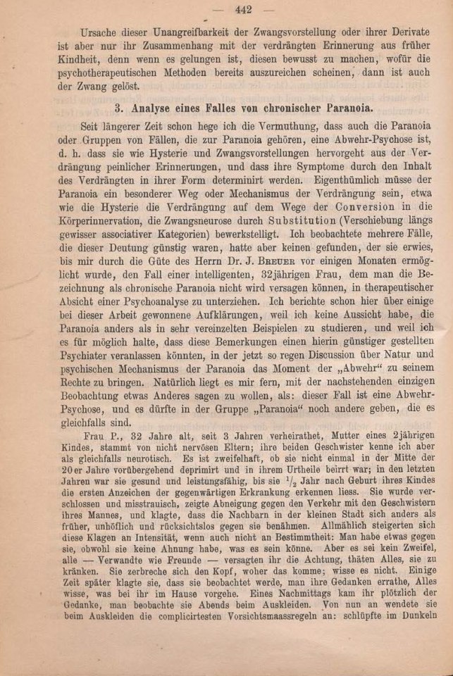 Seit längerer Zeit schon hege ich die Vermutung, daß auch die Paranoia—oder Gruppen von Fällen, die zur Paranoia gehören—eine Abwehrpsychose ist, d. h. daß sie wie Hysterie und Zwangsvorstellungen hervorgeht aus der Verdrängung peinlicher Erinnerungen, und daß ihre Symptome durch den Inhalt des Verdrängten in ihrer Form determiniert werden. Eigentümlich müsse der Paranoia ein besonderer Weg oder Mechanismus der Verdrängung sein, etwa wie die Hysterie die Verdrängung auf dem Wege der Konversion in die Körperinnervation, die Zwangsneurose durch Substitution (Verschiebung längs gewisser assoziativer Kategorien) bewerkstelligt. Ich beobachtete mehrere Fälle, die dieser Deutung günstig waren, hatte aber keinen gefunden, der sie erwies, bis mir durch die Güte des Herrn Dr. J. Breuer vor einigen Monaten ermöglicht wurde, den Fall einer intelligenten zweiunddreißigjährigen Frau, dem man die Bezeichnung als chronische Paranoia nicht wird versagen können, in therapeutischer Absicht einer Psychoanalyse zu unterziehen. Ich berichte schon hier über einige bei dieser Arbeit gewonnene Aufklärungen, weil ich keine Aussicht habe, die Paranoia anders als in sehr vereinzelten Beispielen zu studieren, und weil ich es für möglich halte, daß diese Bemerkungen einen hierin günstiger gestellten Psychiater veranlassen könnten, in der jetzt so regen Diskussion über Natur und psychischen Mechanismus der Paranoia das Moment der “Abwehr” zu seinem Rechte zu bringen. Natürlich liegt es mir fern, mit der nachstehenden einzigen Beobachtung etwas anderes sagen zu wollen, als: dieser Fall ist eine Abwehrpsychose, und es dürfte in der Gruppe “Paranoia” noch andere geben, die es gleichfalls sind.