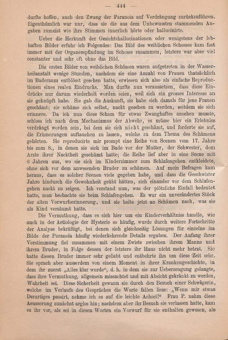 ins Bett und entkleidete sich erst unter der Decke. Da sie jedem Verkehr auswich, sich schlecht nährte und sehr verstimmt war, wurde sie im Sommer 1895 in eine Wasserheilanstalt geschickt. Dort traten neue Symptome auf und verstärkten sich schon vorhandene. Schon im Frühjahr hatte sie plötzlich eines Tages, als sie mit ihrem Stubenmädchen allein war, eine Empfindung im Schoße bekommen und sich dabei gedacht, das Mädchen habe jetzt einen unanständigen Gedanken. Diese Empfindung wurde im Sommer häufiger, nahezu kontinuierlich, sie spürte ihre Genitalien, “wie man eine schwere Hand spürt”. Dann fing sie an, Bilder zu sehen, über die sie sich entsetzte, Halluzinationen von weiblichen Nacktheiten, besonders einen entblößten weiblichen Schoß mit Behaarung; gelegentlich auch männliche Genitalien. Das Bild des behaarten Schoßes und die Organempfindung im Schoße kamen meist gemeinsam. Die Bilder wurden sehr quälend für sie, da sie dieselben regelmäßig bekam, wenn sie in Gesellschaft einer Frau war und daran die Deutung sich anschloß, sie sehe jetzt die Frau in unanständigster Blöße, aber im selben Moment habe die Frau dasselbe Bild von ihr (!). Gleichzeitig mit diesen Gesichtshalluzinationen — die nach ihrem ersten Auftreten in der Heilanstalt für mehrere Monate wieder verschwanden — fingen Stimmen an, sie zu belästigen, die sie nicht erkannte und sich nicht zu erklären wußte. Wenn sie auf der Straße war, hieß es: Das ist die Frau P. — Da geht sie. Wo geht sie hin? — Man kommentierte jede ihrer Bewegungen und Handlungen, gelegentlich hörte sie Drohungen und Vorwürfe. Alle diese Symptome wurden ärger, wenn sie in Gesellschaft oder gar auf der Straße war; sie verweigerte darum auszugehen, erklärte dann, sie habe Ekel vor dem Essen und kam rasch herunter.