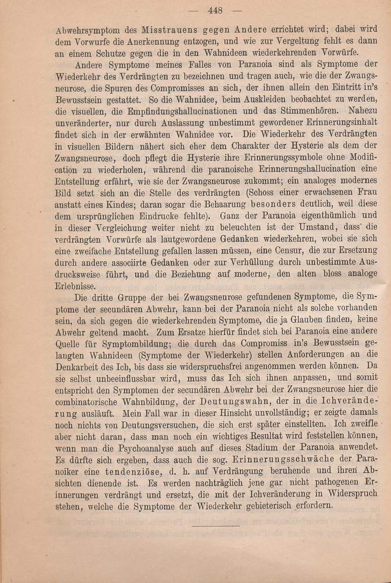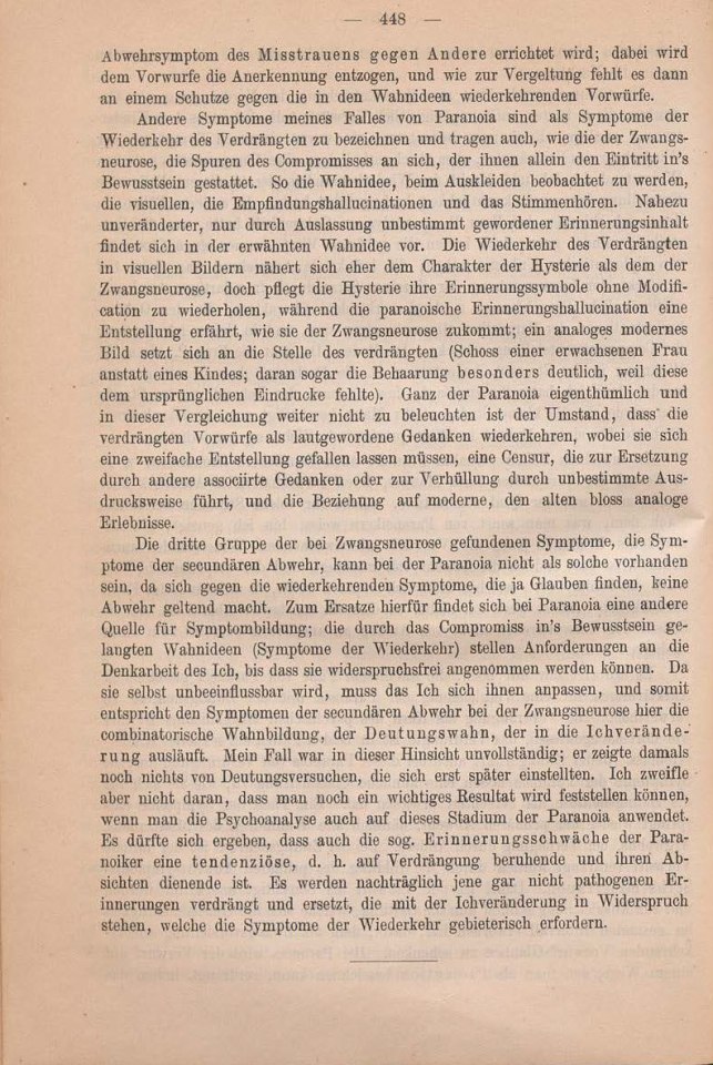 dieser Hinsicht unvollständig; er zeigte damals noch nichts von Deutungsversuchen, die sich erst später einstellten. Ich zweifle aber nicht daran, daß man noch ein wichtiges Resultat wird feststellen können, wenn man die Psychoanalyse auch auf dieses Stadium der Paranoia anwendet. Es dürfte sich ergeben, daß auch die sogenannte Erinnerungsschwäche der Paranoiker eine tendenziöse, d. h. auf Verdrängung beruhende und ihren Absichten dienende ist. Es werden nachträglich jene gar nicht pathogenen Erinnerungen verdrängt und ersetzt, die mit der Ich-Veränderung in Widerspruch stehen, welche die Symptome der Wiederkehr gebieterisch erfordern.