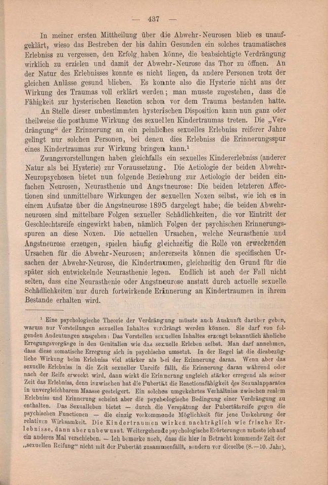 Fähigkeit zur hysterischen Reaction schon vor dem Trauma bestanden hatte.An Stelle dieser unbestimmten hysterischen Disposition kann nun ganz oder teilweise die posthume Wirkung des sexuellen Kindertraumas treten. Die “Verdrängung” der Erinnerung an ein peinliches sexuelles Erlebnis reiferer Jahre gelingt nur solchen Personen, bei denen dies Erlebnis die Erinnerungsspur eines Kindertraumas zur Wirkung bringen kann.1
