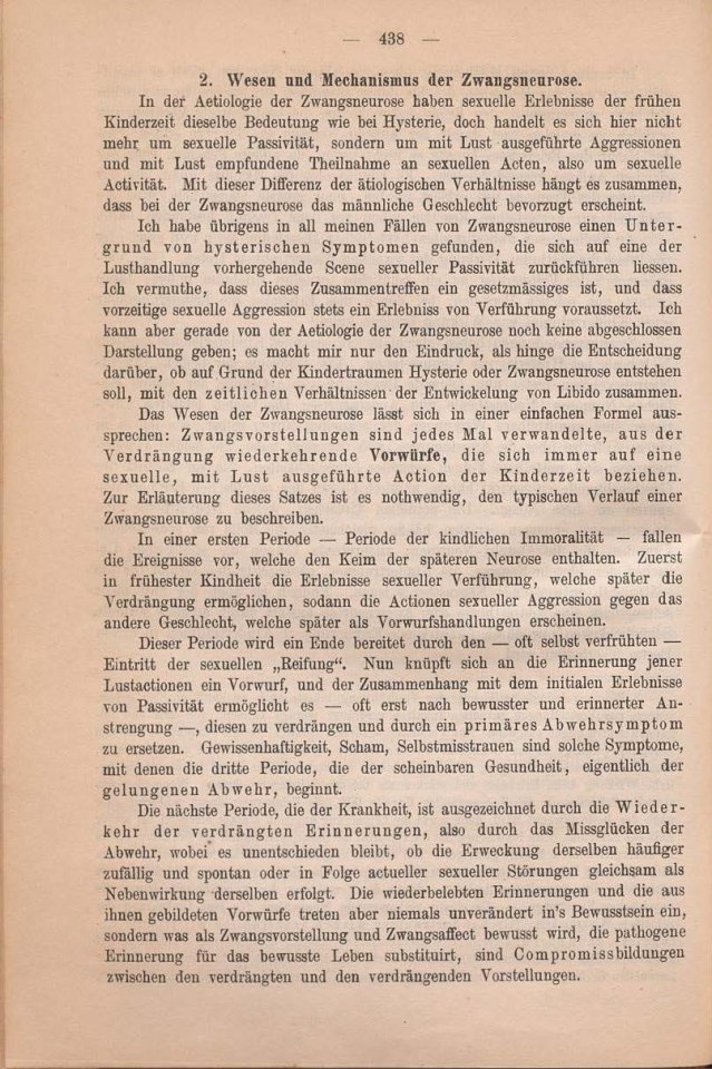 In der Ätiologie der Zwangsneurose haben sexuelle Erlebnisse der frühen Kinderzeit dieselbe Bedeutung wie bei Hysterie, doch handelt es sich hier nicht mehr um sexuelle Passivität, sondern um mit Lust ausgeführte Aggressionen und mit Lust empfundene Teilnahme an sexuellen Akten, also um sexuelle Aktivität. Mit dieser Differenz der ätiologischen Verhältnisse hängt es zusammen, daß bei der Zwangsneurose das männliche Geschlecht bevorzugt erscheint.