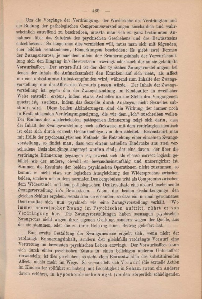 Um die Vorgänge der Verdrängung, der Wiederkehr des Verdrängten und der Bildung der pathologischen Kompromißvorstellungen anschaulich und wahrscheinlich zutreffend zu beschreiben, müßte man sich zu ganz bestimmten Annahmen über das Substrat des psychischen Geschehens und des Bewußtseins entschließen. So lange man dies vermeiden will, muß man sich mit folgenden, eher bildlich verstandenen Bemerkungen bescheiden: Es gibt zwei Formen der Zwangsneurose, je nachdem allein der Erinnerungsinhalt der Vorwurfshandlung sich den Eingang ins Bewußtsein erzwingt oder auch der an sie geknüpfte Vorwurfsaffekt. Der erstere Fall ist der der typischen Zwangsvorstellungen, bei denen der Inhalt die Aufmerksamkeit des Kranken auf sich zieht, als Affekt nur eine unbestimmte Unlust empfunden wird, während zum Inhalt der Zwangsvorstellung nur der Affekt des Vorwurfs passen würde. Der Inhalt der Zwangsvorstellung ist gegen den der Zwangshandlung im Kindesalter in zweifacher Weise entstellt: erstens, indem etwas Aktuelles an die Stelle des Vergangenen gesetzt ist, zweitens, indem das Sexuelle durch Analoges, nicht Sexuelles, substituiert wird. Diese beiden Abänderungen sind die Wirkung der immer noch in Kraft stehenden Verdrängungsneigung, die wir dem “Ich” zuschreiben wollen. Der Einfluß der wiederbelebten pathogenen Erinnerung zeigt sich darin, daß der Inhalt der Zwangsvorstellung noch stückweise mit dem Verdrängten identisch ist oder sich durch korrekte Gedankenfolge von ihm ableitet. Rekonstruiert man mit Hilfe der psychoanalyti-schen Methode die Entstehung einer einzelnen Zwangsvorstellung, so findet man, daß von einem aktuellen Eindrucke aus zwei verschiedene Gedankengänge angeregt worden sind; der eine davon, der über die verdrängte Erinnerung gegangen ist, erweist sich als ebenso korrekt logisch gebildet wie der andere, obwohl er bewußtseinsunfähig und unkorrigierbar ist. Stimmen die Resultate der beiden psychischen Operationen nicht zusammen, so kommt es nicht etwa zur logischen Ausgleichung des Widerspruches zwischen beiden, sondern neben dem normalen Denkergebnisse tritt als Kompromiß zwischen dem Widerstande und dem pathologischen Denkresultate eine absurd erscheinende Zwangsvorstellung ins Bewußtsein. Wenn die beiden Gedankengänge den gleichen Schluß ergeben, verstärken sie einander, so daß ein normal gewonnenes Denkresultat sich nun psychologisch wie eine Zwangsvorstellung verhält. Wo immer neurotischer Zwang im Psychischen auftritt, rührt er von Verdrängung her. Die Zwangsvorstellungen haben sozusagen psychischen Zwangskurs nicht wegen ihrer eigenen Geltung, sondern wegen der Quelle, aus der sie stammen, oder die zu ihrer Geltung einen Beitrag geliefert hat.