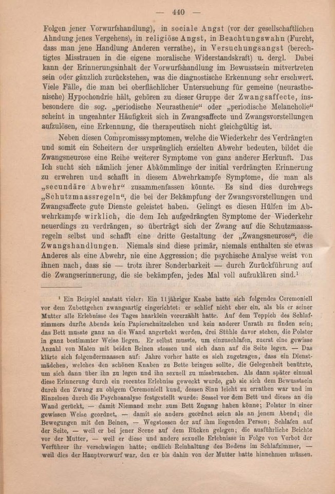 daß sie—trotz ihrer Sonderbarkeit—durch Zurückführung auf die Zwangserinnerung, die sie bekämpfen, jedesmal voll aufzuklären sind.11 Ein Beispiel anstatt vieler: Ein elfjähriger Knabe hatte sich folgendes Zeremoniell vor dem Zubettgehen zwangsartig eingerichtet: Er schlief nicht eher ein, als bis er seiner Mutter alle Erlebnisse des Tages haarklein vorerzählt hatte; auf dem Teppich des Schlafzimmers durfte abends kein Papierschnitzelchen und kein anderer Unrat zu finden sein; das Bett mußte ganz an die Wand angerückt werden, drei Stühle davorstehen, die Polster in ganz bestimmter Weise liegen. Er selbst mußte, um einzuschlafen, zuerst eine gewisse Anzahl von Malen mit beiden Beinen stoßen und sich dann auf die Seite legen.—Das klärte sich folgendermaßen auf: Jahre vorher hatte es sich zugetragen, daß ein Dienstmädchen, welches den schönen Knaben zu Bette bringen sollte, die Gelegenheit benützte, um sich dann über ihn zu legen und ihn sexuell zu mißbrauchen. Als dann später einmal diese Erinnerung durch ein rezentes Erlebnis geweckt wurde, gab sie sich dem Bewußtsein durch den Zwang zu obigem Zeremoniell kund, dessen Sinn leicht zu erraten war und im einzelnen durch die Psychoanalyse festgestellt wurde: Sessel vor dem Bett und dieses an die Wand gerückt—damit niemand mehr zum Bett Zugang haben könne; Polster in einer gewissen Weise geordnet—damit sie anders geordnet seien als an jenem Abend; die Bewegungen mit den Beinen—Wegstoßen der auf ihm liegenden Person; Schlafen auf der Seite—weil er bei der Szene auf dem Rücken gelegen; die ausführliche Beichte vor der Mutter—weil er diese und andere sexuelle Erlebnisse infolge von Verbot der Verführerin ihr verschwiegen hatte; endlich Reinhaltung des Bodens im Schlafzimmer—weil dies der Hauptvorwurf war, den er bis dahin von der Mutter hatte hinnehmen müssen.