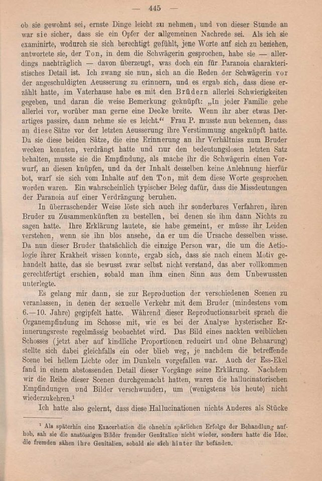 ob sie gewohnt sei, ernste Dinge leicht zu nehmen, und von dieser Stunde an war sie sicher, daß sie ein Opfer der allgemeinen Nachrede sei. Als ich sie examinierte, wodurch sie sich berechtigt gefühlt, jene Worte auf sich zu beziehen, antwortete sie, der Ton, in dem die Schwägerin gesprochen, habe sie — allerdings nachträglich — davon überzeugt, was doch ein für Paranoia charakteristisches Detail ist. Ich zwang sie nun, sich an die Reden der Schwägerin vor der angeschuldigten Äußerung zu erinnern, und es ergab sich, daß diese erzählt hatte, im Vaterhause habe es mit den Brüdern allerlei Schwierigkeiten gegeben, und daran die weise Bemerkung geknüpft: “In jeder Familie gehe allerlei vor, worüber man gerne eine Decke breite. Wenn ihr aber Derartiges passiere, dann nehme sie es leicht.” Frau P. mußte nun bekennen, daß an diese Sätze vor der letzten Äußerung ihre Verstimmung angeknüpft hatte. Da sie diese beiden Sätze, die eine Erinnerung an ihr Verhältnis zum Bruder wecken konnten, verdrängt hatte und nur den bedeutungslosen letzten Satz behalten, mußte sie die Empfindung, als mache ihr die Schwägerin einen Vorwurf, an diesen knüpfen, und da der Inhalt desselben keine Anlehnung hiefür bot, warf sie sich vom Inhalte auf den Ton, mit dem diese Worte gesprochen worden waren. Ein wahrscheinlich typischer Beleg dafür, daß die Mißdeutungen der Paranoia auf einer Verdrängung beruhen.