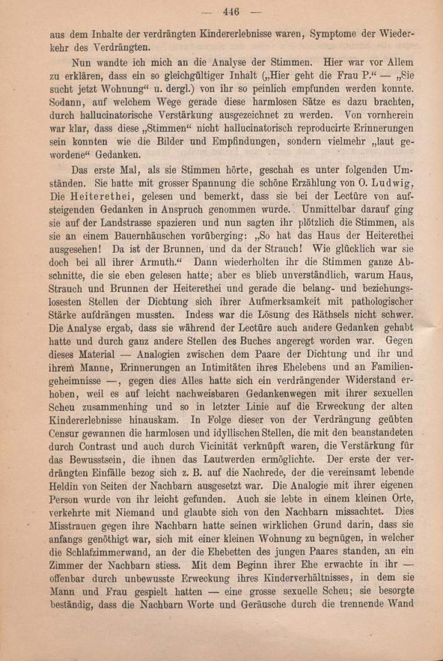 Das erstemal, als sie Stimmen hörte, geschah es unter folgenden Umständen: Sie hatte mit großer Spannung die schöne Erzählung von O. Ludwig, “Die Heiterethei” gelesen und bemerkt, daß sie bei der Lektüre von aufsteigenden Gedanken in Anspruch genommen wurde. Unmittelbar darauf ging sie auf der Landstraße spazieren, und nun sagten ihr plötzlich die Stimmen, als sie an einem Bauernhäuschen vorüberging: “So hat das Haus der Heiterethei ausgesehen! Da ist der Brunnen und da der Strauch! Wie glücklich war sie doch bei all ihrer Armut!” Dann wiederholten ihr die Stimmen ganze Abschnitte, die sie eben gelesen hatte; aber es blieb unverständlich, warum Haus, Strauch und Brunnen der Heiterethei und gerade die belang- und beziehungslosesten Stellen der Dichtung sich ihrer Aufmerksamkeit mit pathologischer Stärke aufdrängen mußten. Indes war die Lösung des Rätsels nicht schwer. Die Analyse ergab, daß sie während der Lektüre auch andere Gedanken gehabt hatte und durch ganz andere Stellen des Buches angeregt worden war. Gegen dieses Material — Analogien zwischen dem Paare der Dichtung und ihr und ihrem Manne, Erinnerungen an Intimitäten ihres Ehelebens und an Familiengeheimnisse — gegen dies alles hatte sich ein verdrängender Widerstand erhoben, weil es auf leicht nachweisbaren Gedankenwegen mit ihrer sexuellen Scheu zusammenhing und so in letzter Linie auf die Erweckung der alten Kindererlebnisse hinauskam. Infolge dieser von der Verdrängung geübten Zensur gewannen die harmlosen und idyllischen Stellen, die mit den beanstandeten durch Kontrast und auch durch Vizinität verknüpft waren, die Verstärkung für das Bewußtsein, die ihnen das Lautwerden ermöglichte. Der erste der verdrängten Einfälle bezog sich z. B. auf die Nachrede, der die vereinsamt lebende Heldin von seiten der Nachbarn ausgesetzt war. Die Analogie mit ihrer eigenen Person wurde von ihr leicht gefunden. Auch sie lebte in einem kleinen Orte, verkehrte mit niemand und glaubte sich von den Nachbarn mißachtet. Dies Mißtrauen gegen ihre Nachbarn hatte seinen wirklichen Grund darin, daß sie anfangs genötigt war, sich mit einer kleinen Wohnung zu begnügen, in welcher die Schlafzimmerwand, an der die Ehebetten des jungen Paares standen, an ein Zimmer der Nachbarn stieß. Mit dem Beginn ihrer Ehe erwachte in ihr — offenbar durch unbewußte Erweckung ihres Kinderverhältnisses, in dem sie Mann und Frau gespielt hatten — eine große sexuelle Scheu; sie besorgte beständig, daß die Nachbarn Worte und Geräusche durch die trennende Wand