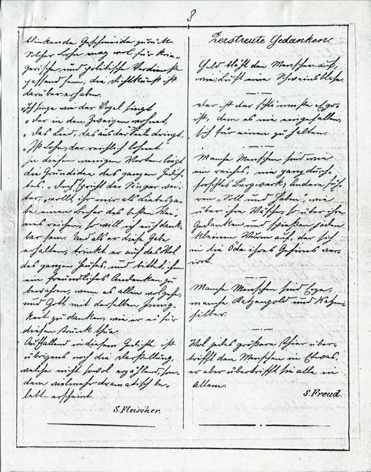 | Freud, Sigmund | 1871-041/1871 | 1871a | 40 | Zerstreute Gedanken | Musarion, 1, 1871, 1 | 8 | Fertig ✔ | Fertig ✔ | Ganz fertig / zutreffend ✔ | Fehlt ✖ | Fehlt ✖ | Ganz fertig / zutreffend ✔ | ✔ | EB | ✔ |