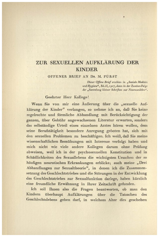 Freud, Sigmund | 1907-003/1924 | 1907c | 10599 | Zur sexuellen Aufklärung der Kinder | GS 5 | 134–142 | Fertig ✔ | Fertig ✔ | Ganz fertig / zutreffend ✔ | Fehlt ✖ | Fehlt ✖ | Ganz fertig / zutreffend ✔ | ✔ | EB | ✔ | ||